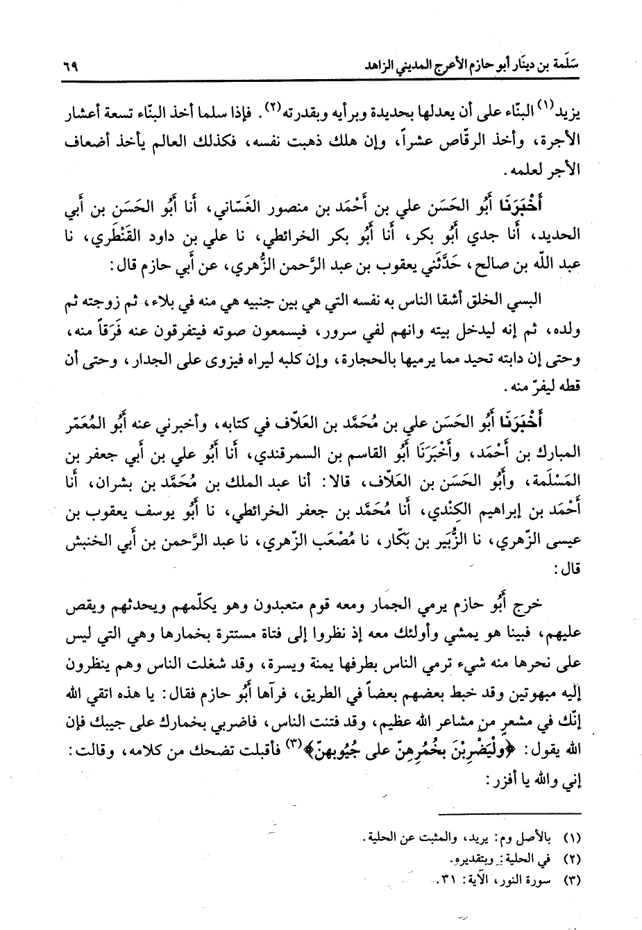 يزيد (1) البناء على أن يعدلها بحديدة وبرأيه وبقدرته (2) فإذا سلما أخذ البناء تسعة أعشار الأجرة وأخذ الرقاص عشرا وإن هلك ذهبت نفسه فكذلك العالم يأخذ أضعاف الأجر لعلمه أخبرنا أبو الحسن علي بن أحمد بن منصور الغساني أنا أبو الحسن بن أبي الحديد أنا جدي أبو بكر أنا أبو بكر الخرائطي نا علي بن داود القنطري نا عبد الله بن صالح حدثني يعقوب بن عبد الرحمن الزهري عن أبي حازم قال البسي الخلق أشقا الناس به نفسه التي هي بين جنبيه هي منه في بلاء ثم زوجته ثم ولده ثم إنه ليدخل بيته وانهم لفي سرور فيسمعون صوته فيتفرقون عنه فرقا منه وحتى إن دابته تحيد مما يرميها بالحجارة وإن كلبه ليراه فيزوى على الجدار وحتى أن قطه ليفر منه أخبرنا أبو الحسن علي بن محمد بن العلاف في كتابه وأخبرني عنه أبو المعمر المبارك بن أحمد وأخبرنا أبو القاسم بن السمرقندي أنا أبو علي بن أبي جعفر بن المسلمة وأبو الحسن بن العلاف قالا أنا عبد الملك بن محمد بن بشران أنا أحمد بن إبراهيم الكندي أنا محمد بن جعفر الخرائطي نا أبو يوسف يعقوب بن عيسى الزهري نا الزبير بن بكار نا مصعب الزهري نا عبد الرحمن بن أبي الخنبش قال خرج أبو حازم يرمي الجمار ومعه قوم متعبدون وهو يكلمهم ويحدثهم ويقص عليهم فبينا هو يمشي وأولئك معه إذ نظروا إلى فتاة مستترة بخمارها وهي التي ليس على نحرها منه شئ ترمي الناس بطرفها يمنة ويسرة وقد شغلت الناس وهم ينظرون إليه مبهوتين وقد خبط بعضهم بعضا في الطريق فرآها أبو حازم فقال يا هذه اتقي الله إنك في مشعر من مشاعر الله عظيم وقد فتنت الناس فاضربي بخمارك على جيبك فإن الله يقول " وليضربن بخمرهن على جيوبهن " (3) فأقبلت تضحك من كلامه وقالت إني والله يا أفزر