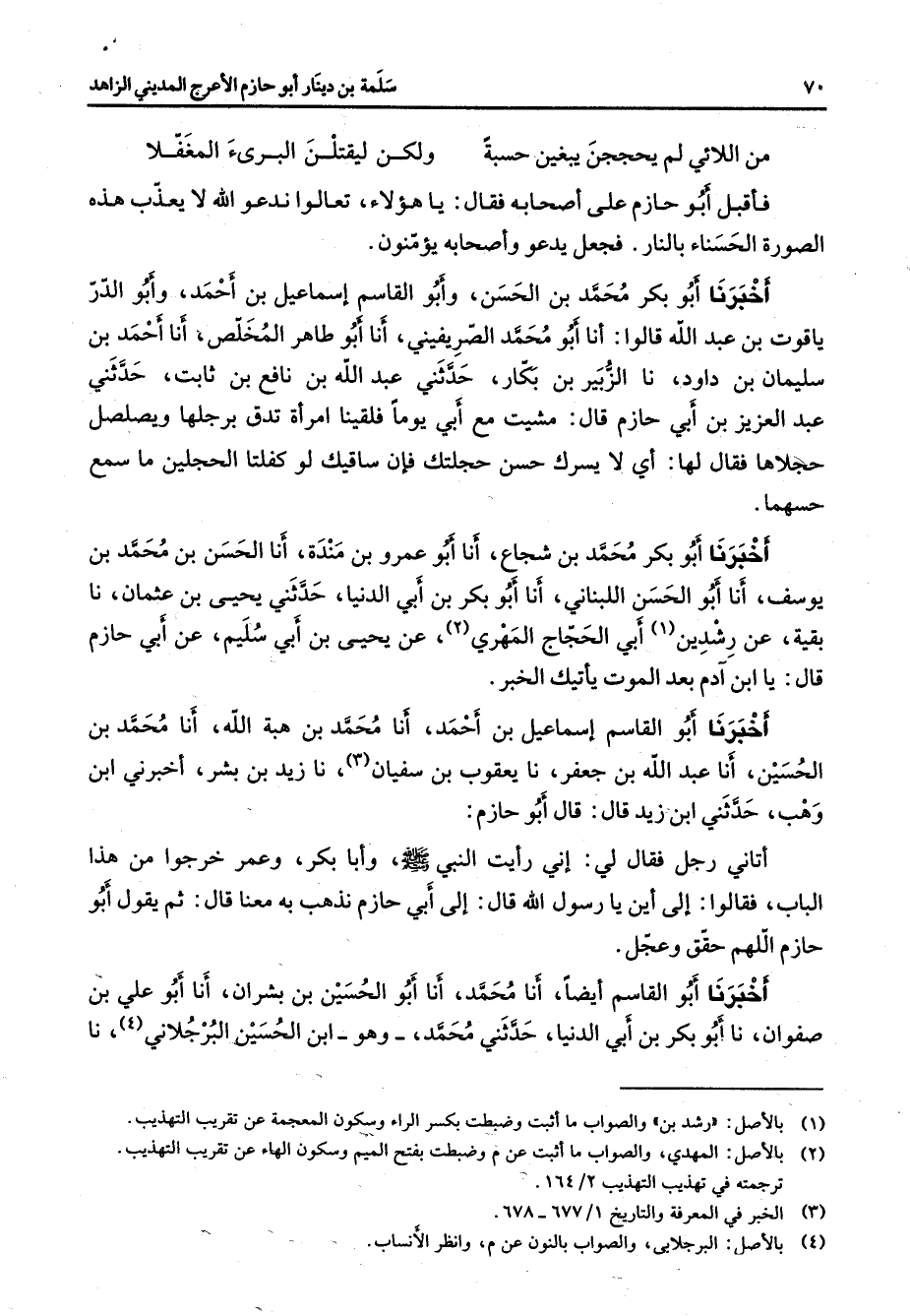 * من اللائي لم يحججن يبغين حسبة * ولكن ليقتلن البرئ المغفلا * فأقبل أبو حازم على أصحابه فقال يا هؤلاء تعالوا ندعو الله لا يعذب هذه الصورة الحسناء بالنار فجعل يدعو وأصحابه يؤمنون أخبرنا أبو بكر محمد بن الحسن وأبو القاسم إسماعيل بن أحمد وأبو الدر ياقوت بن عبد الله قالوا أنا أبو محمد الصريفيني أنا أبو طاهر المخلص أنا أحمد بن سليمان بن داود نا الزبير بن بكار حدثني عبد الله بن نافع بن ثابت حدثني عبد العزيز بن أبي حازم قال مشيت مع أبي يوما فلقينا امرأة تدق برجلها ويصلصل حجلاها فقال لها أي لا يسرك حسن حجلتك فإن ساقيك لو كفلتا الحجلين ما سمع حسهما أخبرنا أبو بكر محمد بن شجاع أنا أبو عمرو بن مندة أنا الحسن بن محمد بن يوسف أنا أبو الحسن اللبناني أنا أبو بكر بن أبي الدنيا حدثني يحيى بن عثمان نا بقية عن رشدين (1) أبي الحجاج المهري (2) عن يحيى بن أبي سليم عن أبي حازم قال يا ابن آدم بعد الموت يأتيك الخبر أخبرنا أبو القاسم إسماعيل بن أحمد أنا محمد بن هبة الله أنا محمد بن الحسين أنا عبد الله بن جعفر نا يعقوب بن سفيان (3) نا زيد بن بشر أخبرني ابن وهب حدثني ابن زيد قال قال أبو حازم أتاني رجل فقال لي إني رأيت النبي (صلى الله عليه وسلم) وأبا بكر وعمر خرجوا من هذا الباب فقالوا إلى أين يا رسول الله قال إلى أبي حازم نذهب به معنا قال ثم يقول أبو حازم اللهم حقق وعجل أخبرنا أبو القاسم أيضا أنا محمد أنا أبو الحسين بن بشران أنا أبو علي بن صفوان نا أبو بكر بن أبي الدنيا حدثني محمد وهو ابن الحسين البرجلاني (4) نا