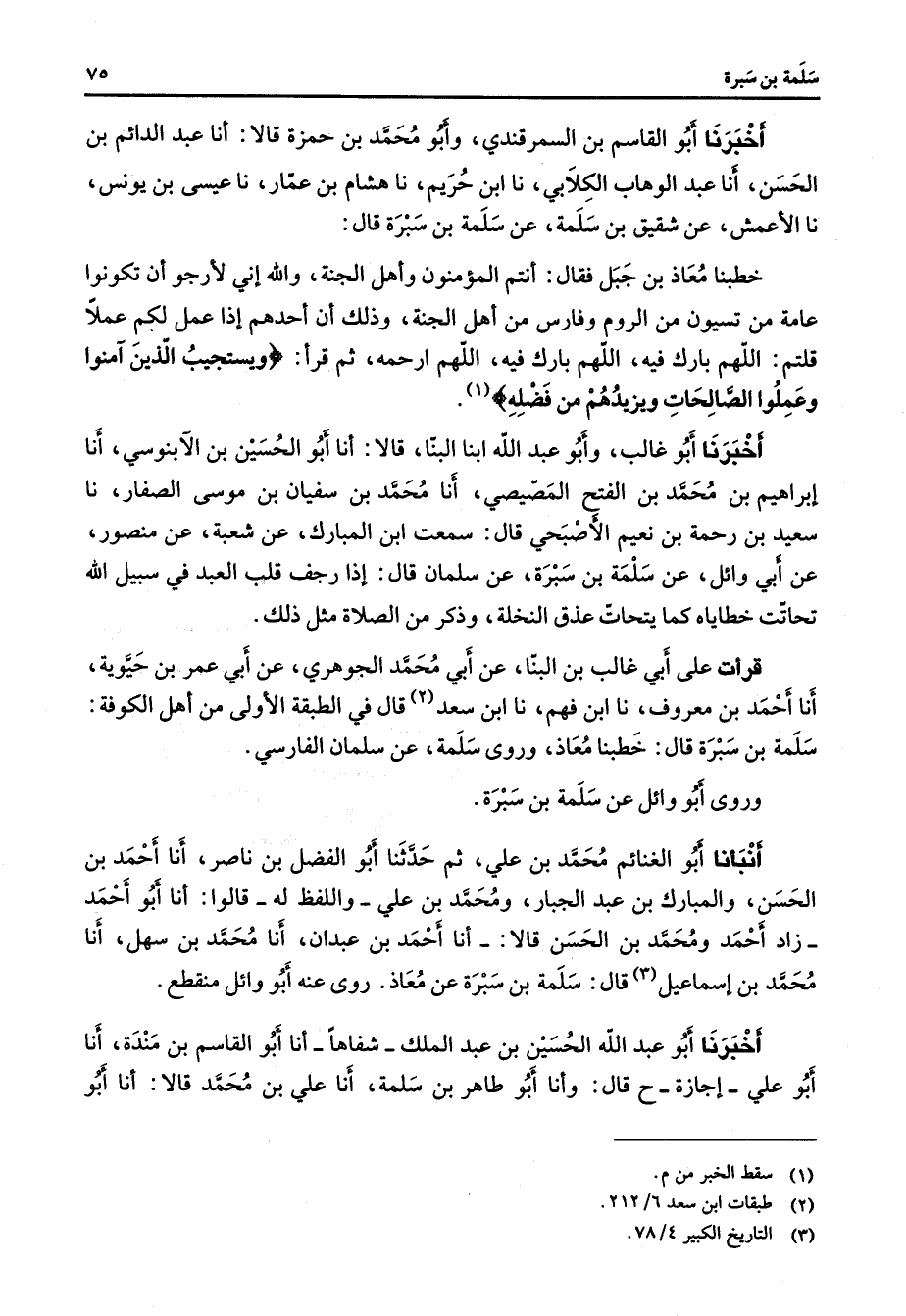 أخبرنا أبو غالب وأبو عبد الله ابنا البنا قالا أنا أبو الحسين بن الآبنوسي أنا إبراهيم بن محمد بن الفتح المصيصي أنا محمد بن سفيان بن موسى الصفار نا سعيد بن رحمة بن نعيم الأصبحي قال سمعت ابن المبارك عن شعبة عن منصور عن أبي وائل عن سلمة بن سبرة عن سلمان قال إذا رجف قلب العبد في سبيل الله تحاتت خطاياه كما يتحات عذق النخلة وذكر من الصلاة مثل ذلك قرأت على أبي غالب بن البنا عن أبي محمد الجوهري عن أبي عمر بن حيوية أنا أحمد بن معروف نا ابن فهم نا ابن سعد قال (2) في الطبقة الأولى من أهل الكوفة سلمة بن سبرة قال خطبنا معاذ وروى سلمة عن سلمان الفارسي وروى أبو وائل عن سلمة بن سبرة أبنأنا أبو الغنائم محمد بن علي ثم حدثنا أبو الفضل بن ناصر أنا أحمد بن الحسن والمبارك بن عبد الجبار ومحمد بن علي واللفظ له قالوا أنا أبو أحمد زاد أحمد ومحمد بن الحسن قالا أنا أحمد بن عبدان أنا محمد بن سهل أنا محمد بن إسماعيل (3) قال سلمة بن سبرة عن معاذ روى عنه أبو وائل منقطع أخبرنا أبو عبد الله الحسين بن عبد الملك شفاها أنا أبو القاسم بن مندة أنا أبو علي إجازة قال وأنا أبو طاهر بن سلمة أنا علي بن محمد قالا أنا أبو