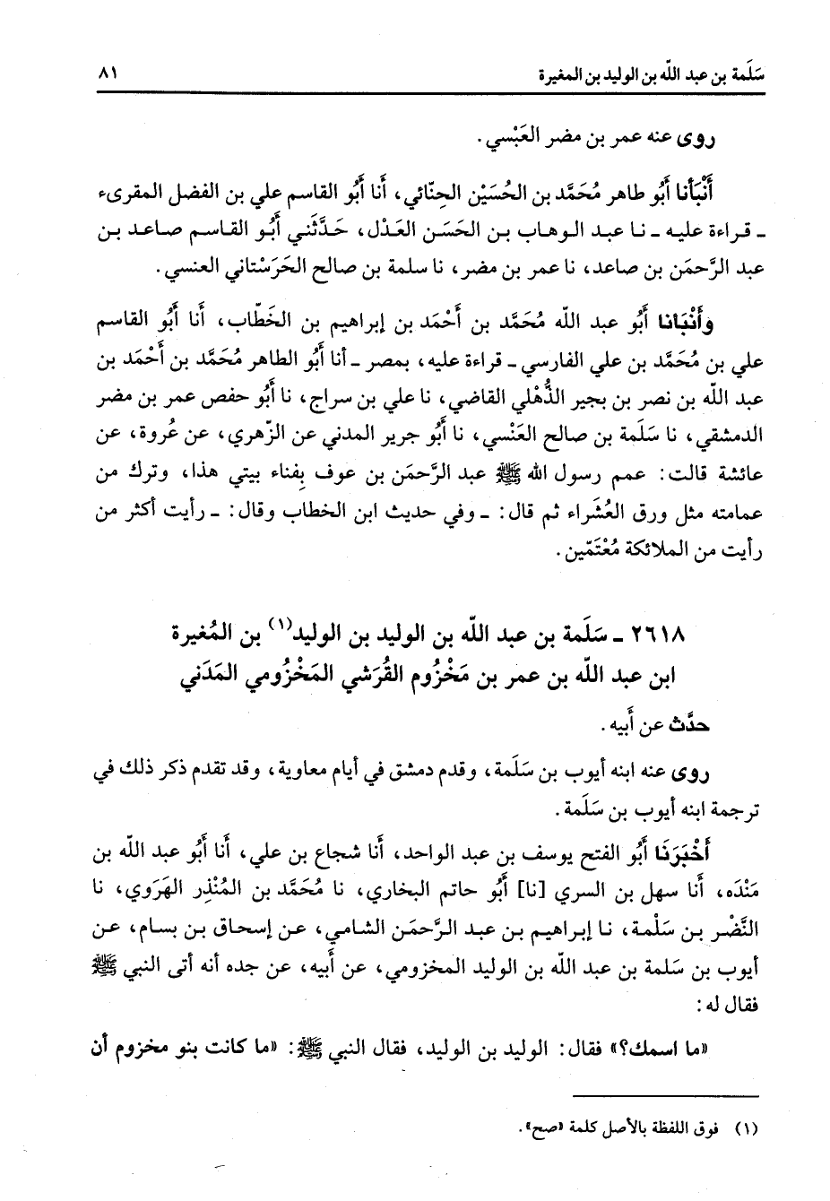 2618 - سلمة بن عبد الله بن الوليد بن الوليد (1) بن المغيرة ابن عبد الله بن عمر بن مخزوم القرشي المخزومي المدني حدث عن أبيه روى عنه ابنه أيوب بن سلمة وقدم دمشق في أيام معاوية وقد تقدم ذكر ذلك في ترجمة ابنه أيوب بن سلمة أخبرنا أبو الفتح يوسف بن عبد الواحد أنا شجاع بن علي أنا أبو عبد الله بن منده أنا سهل بن السري نا أبو حاتم البخاري نا محمد بن المنذر الهروي نا النضر بن سلمة نا إبراهيم بن عبد الرحمن الشامي عن إسحاق بن بسام عن أيوب بن سلمة بن عبد الله بن الوليد المخزومي عن أبيه عن جده أنه أتى النبي (صلى الله عليه وسلم) فقال له ما اسمك فقال الوليد بن الوليد فقال النبي (صلى الله عليه وسلم) ما كانت بنو مخزوم