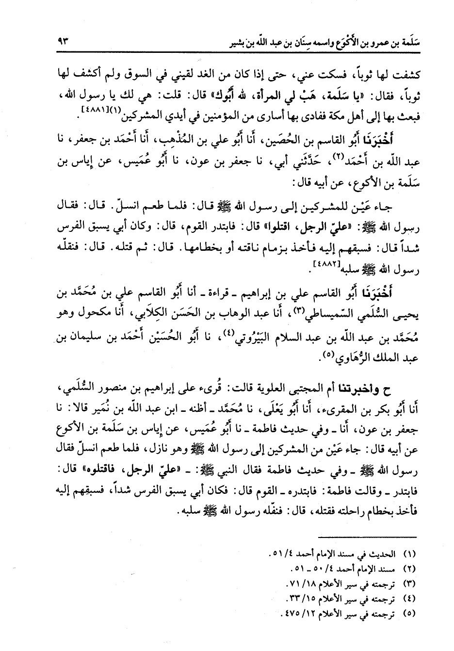 كشفت لها ثوبا فسكت عني حتى إذا كان من الغد لقيني في السوق ولم أكشف لها ثوبا فقال يا سلمة هب لي المرأة لله أبوك قال قلت هي لك يا رسول الله فبعث بها إلى أهل مكة ففادي بها أسارى من المؤمنين في أيدي المشركين أخبرنا أبو القاسم بن الحصين أنا أبو علي بن المذهب أنا أحمد بن جعفر نا عبد الله بن أحمد (2) حدثني أبي نا جعفر بن عون نا أبو عميس عن إياس بن سلمة بن الأكوع عن أبيه قال جاء عين للمشركين إلى رسول الله (صلى الله عليه وسلم) قال فلما طعم انسل قال فقال رسول الله (صلى الله عليه وسلم) علي الرجل اقتلوا قال فابتدر القوم قال وكان أبي يسبق الفرس شدا قال فسبقهم إليه فاخذ بزمام ناقته أو بخطامها قال ثم قتله قال فنقله رسول الله (صلى الله عليه وسلم) سلبه أخبرنا أبو القاسم علي بن إبراهيم قراءة أنا أبو القاسم علي بن محمد بن يحيى السلمي السميساطي (3) أنا عبد الوهاب بن الحسن الكلابي أنا مكحول وهو محمد بن عبد الله بن عبد السلام البيروتي (4) نا أبو الحسين أحمد بن سليمان بن عبد الملك الرهاوي (5)