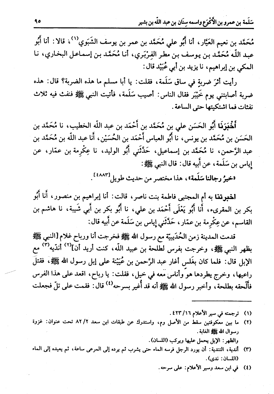 بن محمد بن نعيم العيار أنا أبو علي محمد بن عمر بن يوسف الشبوي (1) قالا أنا أبو عبد الله محمد بن يوسف بن مطر الفربري أنا محمد بن إسماعيل البخاري نا المكي بن إبراهيم نا يزيد بن أبي عبيد قال رأيت أثر ضربة في ساق سلمة فقلت يا أبا مسلم ما هذه الضربة قال هذه ضربة أصابتني يوم خيبر فقال الناس أصيب سلمة فأتيت النبي (صلى الله عليه وسلم) فنفث فيه ثلاث نفثات فما اشتكيتها حتى الساعة أخبرنا أبو الحسن علي بن محمد بن أحمد بن عبد الله الخطيب نا محمد بن الحسن بن محمد بن يونس نا أبو العباس أحمد بن الحسين أنا عبد الله بن محمد بن عبد الرحمن نا محمد بن إسماعيل حدثني أبو الوليد نا عكرمة بن عمار عن إياس بن سلمة عن أبيه قال قال النبي (صلى الله عليه وسلم) خير جالنا سلمة هذا مختصر من حديث طويل أخبرتنا به أم المجتبى فاطمة بنت ناصر قالت أنا إبراهيم بن منصور أنا أبو بكر بن المقرئ أنا أبو يعلى أحمد بن علي نا أبو بكر بن أبي شيبة نا هاشم بن القاسم عن عكرمة بن عمار حدثني إياس بن سلمة عن أبيه قال قدمت المدينة زمن الحديبية مع رسول الله (صلى الله عليه وسلم) فخرجت أنا ورباح غلام النبي (صلى الله عليه وسلم) بظهر النبي (صلى الله عليه وسلم) وخرجت بغرس لطلحة بن عبيد الله كنت أريد أن (2) أنديه (3) مع الإبل قال فلما كان بغلس أغار عبد الرحمن بن عيينة على إبل رسول الله (صلى الله عليه وسلم) فقتل راعيها وخرج يطردها هو وأناس معه في خيل فقلت يا رباح اقعد على هذا الفرس فألحقه بطلحة وأخبر رسول الله (صلى الله عليه وسلم) أنه قد أغير بسرحه (4) قال فقمت على تل فجعلت