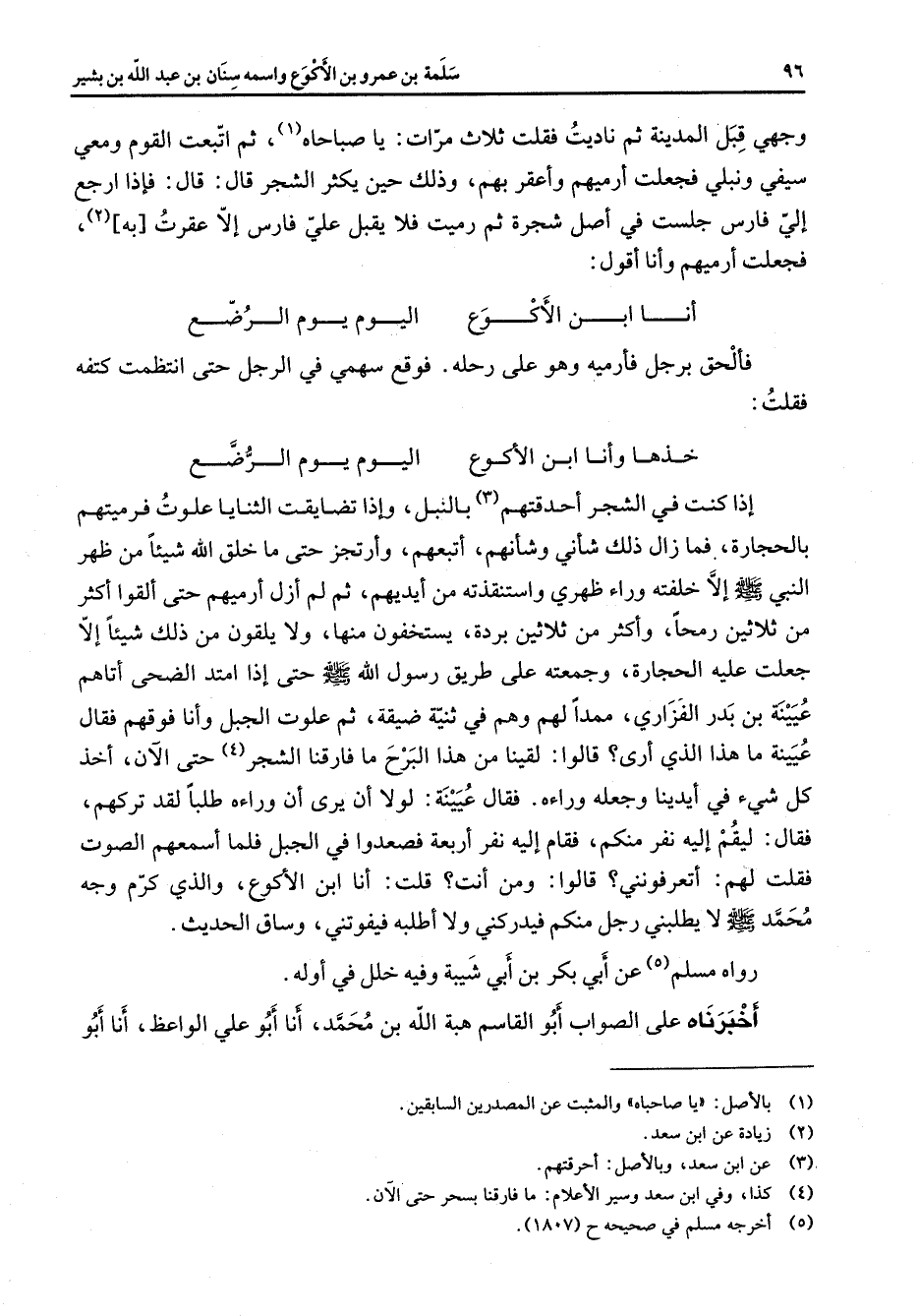 وجهي قبل المدينة ثم ناديت ثلاث مرات يا صباحاه (1) ثم اتبعت القوم ومعي سيفي ونبلي فجعلت أرميهم وأعقر بهم وذلك حين يكثر الشجر قال قال فإذا ارجع إلي فارس جلست في أصل شجرة ثم رميت فلا يقبل علي فارس إلا عقرت به (2) فجعلت أرميهم وأنا أقول * أنا ابن الأكوع * اليوم يوم الرضع * فألحق برجل فأرميه وهو على رحله فوقع سهمي في الرجل حتى انتظمت كتفه فقلت * خذها وأنا ابن الأكوع * اليوم يوم الرضع * إذا كنت في الشجر أحدقتهم (3) بالنبل وإذا تضايقت الثنايا علوت فرميتهم بالحجارة فما زال ذلك شأني وشأنهم أتبعهم وأرتجز حتى ما خلق الله شيئا من ظهر النبي (صلى الله عليه وسلم) إلا خلفته وراء ظهري واستنقذته من أيديهم ثم لم أزل أرميهم حتى ألقوا أكثر من ثلاثين رمحا وأكثر من ثلاثين بردة يستخفون منها ولا يلقون من ذلك شيئا إلا جعلت عليه الحجارة وجمعته على طريق رسول الله (صلى الله عليه وسلم) حتى إذا امتد الضحى أتاهم عيينة بن بدر الفزاري ممدا لهم وهم في ثنية ضيقة ثم علوت الجبل وأنا فوقهم فقال عيينة ما هذا الذي أرى قالوا لقينا من هذا البرح ما فارقنا الشجر (4) حتى الآن أخذ كل شئ في أيدينا وجعله وراءه فقال عيينة لولا أن يرى أن وراءه طلبا لقد تركهم فقال ليقم إليه نفر منكم فقام إليه نفر أربعة فصعدوا في الجبل فلما أسمعهم الصوت فقلت لهم أتعرفونني قالوا ومن أنت قلت أنا ابن الأكوع والذي كرم وجه محمد (صلى الله عليه وسلم) لا يطلبني رجل منكم فيدركني ولا أطلبه فيفوتني وساق الحديث رواه مسلم (5) عن أبي بكر بن أبي شيبة وفيه خلل في أوله أخبرناه على الصواب أبو القاسم هبة الله بن محمد أنا أبو علي الواعظ أنا أبو