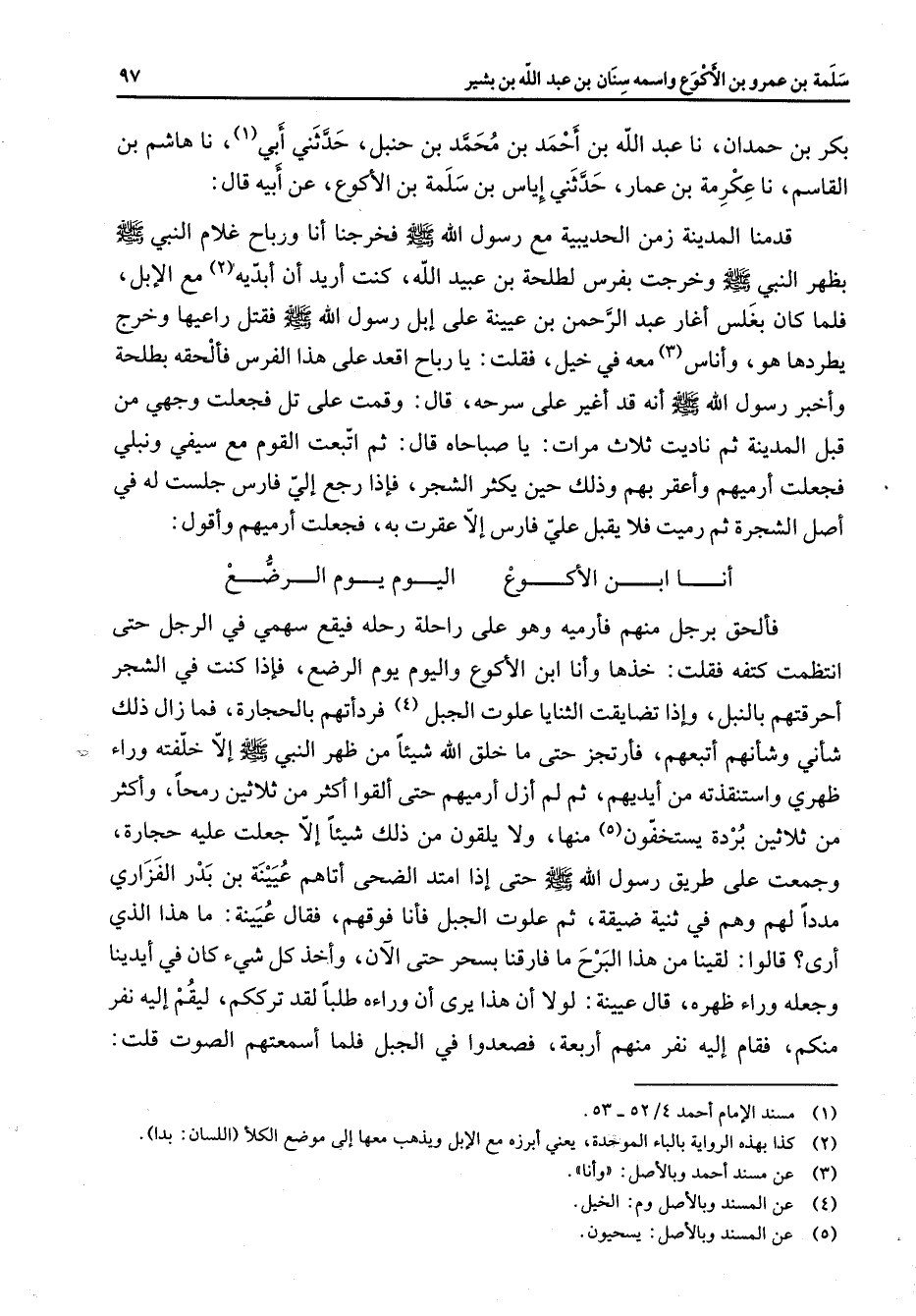 بكر بن حمدان نا عبد الله بن أحمد بن محمد بن حنبل حدثني أبي (1) نا هاشم بن القاسم نا عكرمة بن عمار حدثني إياس بن سلمة بن الأكوع عن أبيه قال قدمنا المدينة زمن الحديبية مع رسول الله (صلى الله عليه وسلم) فخرجنا أنا ورباح غلام النبي (صلى الله عليه وسلم) بظهر النبي (صلى الله عليه وسلم) وخرجت بفرس لطلحة بن عبيد الله كنت أريد أن أبديه (2) مع الإبل فلما كان بغلس أغار عبد الرحمن بن عيينة على إبل رسول الله (صلى الله عليه وسلم) فقتل راعيها وخرج يطردها هو وأناس (3) معه في خيل فقلت يا رباح اقعد على هذا الفرس فألحقه بطلحة وأخبر رسول الله (صلى الله عليه وسلم) أنه قد أغير على سرحه قال وقمت على تل فجعلت وجهي من قبل المدينة ثم ناديت ثلاث مرات يا صباحاه قال ثم اتبعت القوم مع سيفي ونبلي فجعلت أرميهم وأعقر بهم وذلك حين يكثر الشجر فإذا رجع إلي فارس جلست له في أصل الشجرة ثم رميت فلا يقبل علي فارس إلا عقرت به فجعلت أرميهم وأقول * أنا ابن الأكوع * اليوم يوم الرضع * فألحق برجل منهم فأرميه وهو على راحلة رحله فيقع سهمي في الرجل حتى انتظمت كتفه فقلت خذها وأنا ابن الأكوع واليوم يوم الرضع فإذا كنت في الشجر أحرقتهم بالنبل وإذا تضايقت الثنايا علوت الجبل (4) فردأتهم بالحجارة فما زال ذلك شأني وشأنهم أتبعهم فأرتجز حتى ما خلق الله شيئا من ظهر النبي (صلى الله عليه وسلم) إلا خلفته وراء ظهري واستنقذته من أيديهم ثم لم أزل أرميهم حتى ألقوا أكثر من ثلاثين رمحا وأكثر من ثلاثين بردة يستخفون (5) منها ولا يلقون من ذلك شيئا إلا جعلت عليه حجارة وجمعت على طريق رسول الله (صلى الله عليه وسلم) حتى إذا امتد الضحى أتاهم عيينة بن بدر الفزاري مددا لهم وهم في ثنية ضيقة ثم علوت الجبل فأنا فوقهم فقال عيينة ما هذا الذي أرى قالوا لقينا من هذا البرح ما فارقنا بسحر حتى الآن وأخذ كل شئ كان في أيدينا وجعله وراء ظهره قال عيينة لولا أن هذا يرى أن وراءه طلبا لقد ترككم ليقم إليه نفر منكم فقام إليه نفر منهم أربعة فصعدوا في الجبل فلما أسمعتهم الصوت قلت
