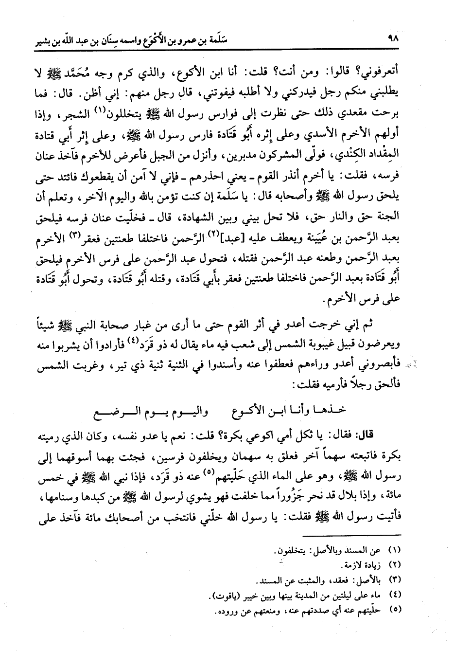أتعرفوني قالوا ومن أنت قلت أنا ابن الأكوع والذي كرم وجه محمد (صلى الله عليه وسلم) لا يطلبني منكم رجل فيدركني ولا أطلبه فيفوتني قال رجل منهم إني أظن قال فما برحت مقعدي ذلك حتى نظرت إلى فوارس رسول الله (صلى الله عليه وسلم) يتخللون (1) الشجر وإذا أولهم الأخرم الأسدي وعلى إثره أبو قتادة فارس الله (صلى الله عليه وسلم) وعلى إثر أبي قتادة المقداد الكندي فولى المشركون مدبرين وأنزل من الجبل فأعرض للأخرم فآخذ عنان فرسه فقلت يا أخرم أنذر القوم يعني احذرهم فإني لا آمن أن يقطعوك فائتد حتى يلحق رسول الله (صلى الله عليه وسلم) وأصحابه قال يا سلمة إن كنت تؤمن بالله واليوم الآخر وتعلم أن الجنة حق والنار حق فلا تحل بيني وبين الشهادة قال فخليت عنان فرسه فيلحق بعبد الرحمن بن عيينة ويعطف عليه عبد (2) الرحمن فاختلفا طعنتين فعقر (3) الأخرم بعبد الرحمن وطعنه عبد الرحمن فقتله فتحول عبد الرحمن على فرس الأخرم فيلحق أبو قتادة بعبد الرحمن فاختلفا طعنتين فعقر بأبي قتادة وقتله أبو قتادة وتحول أبو قتادة على فرس الأخرم ثم إني خرجت أعدو في أثر القوم حتى ما أرى من غبار صحابة النبي (صلى الله عليه وسلم) شيئا ويعرضون قبيل غيبوبة الشمس إلى شعب فيه ماء يقال له ذو قرد (4) فأرادوا أن يشربوا منه فأبصروني أعدو وراءهم فعطفوا عنه وأسندوا في الثنية ثنية ذي تير وغربت الشمس فألحق رجلا فأرميه فقلت * خذها وأنا ابن الأكوع * واليوم يوم الرضع * قال فقال يا ثكل أمي اكوعي بكرة قلت نعم يا عدو نفسه وكان الذي رميته بكرة فاتبعته سهما آخر فعلق به سهمان ويخلفون فرسين فجئت بهما أسوقهما إلى رسول الله (صلى الله عليه وسلم) وهو على الماء الذي حليتهم (5) عنه ذو قرد فإذا نبي الله (صلى الله عليه وسلم) في خمس مائة وإذا بلال قد نحر جزورا مما خلفت فهو يشوي لرسول الله (صلى الله عليه وسلم) من كبدها وسنامها فأتيت رسول الله (صلى الله عليه وسلم) فقلت يا رسول الله خلني فانتخب من أصحابك مائة فآخذ على