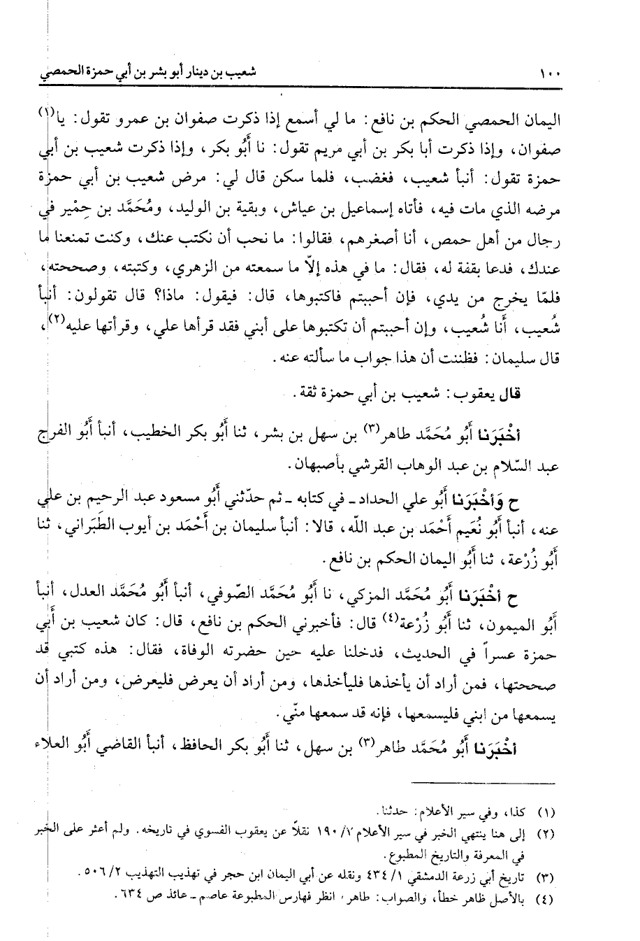اليمان الحمصي الحكم بن نافع ما لي أسمع إذا ذكرت صفوان بن عمرو تقول يا (1) صفوان وإذا ذكرت أبا بكر بن أبي مريم تقول نا أبو بكر وإذا ذكرت شعيب بن أبي حمزة تقول أنبأ شعيب فغضب فلما سكن قال لي مرض شعيب بنأبي حمزة مرضه الذي مات فيه فأتاه إسماعيل بن عياش وبقية بن الوليد ومحمد بن حمير في رجال من أهل حمص أنا أصغرهم فقالوا ما نحب أن نكتب عنك وكنت تمنعنا ما عندك فدعا بقفة له فقال ما في هذه إلا ما سمعته من الزهري وكتبته وصححته فلما يخرج من يدي فإن أحببتم فاكتبوها قال فيقول ماذا قال تقولون أنبأ شعيب أنا شعيب وإن أحببتم أن تكتبوها على أبني فقد قرأها علي وقرأتهها عليه (2) قال سليمان فظننت أن هذا جواب ما سألته عنه قال يعقوب شعيب بن أبي حمزة ثقة أخبرنا أبو محمد طاهر (3) بن سهل بن بشر ثنا أبو بكر الخطيب أنبأ أبو الفرج عبد السلام بن عبد الوهاب القرشي بأصبهان ح وأخبرنا أبو علي الحداد في كتابه ثم حدثني أبو مسعود عبد الرحيم بن علي عنه أنبأ أبو نعيم أحمد بن عبد الله قالا أنبأ سليمان بنأحمد بنأيوب الطبراني ثنا أبو زرعة ثنا أبو اليمان الحكم بن نافع ح أخبرنا أبو محمد المزكي نا أبو محمد الصوفي أنبأ أبو محمد العدل أنبأ أبو الميمون ثنا أبو زرعة (4) قال فأخبرني الحكم بن نافع قال كان شعيب بن أبي حمزة عسرا في الحديث فدخلنا عليه حين حضرته الوفاة فقال هذه كتبي قد صححتها فمن أراد أن يأخذها فليأخذها ومن أراد أن يعرض فليعرض ومن أراد أن يسمعها من ابني فليسمعها فإنه قد سمعها مني أخبرنا أبو محمد طاهر بن سهل ثنا أبو بكر الحافظ أنبأ القاضي أبو العلاء