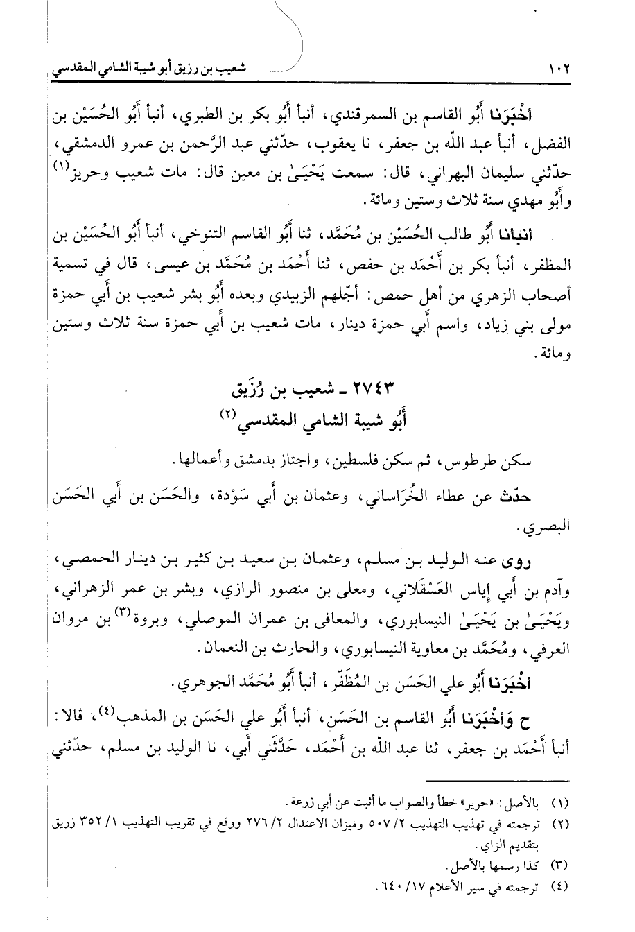2743 - شعيب بن رزيق أبو شيبة الشامي المقدسي (2) سكن طرطوس ثم سكن فلسطين واجتاز بدمشق وأعمالها حدث عن عطاء الخراساني وعثمان بن أبي سودة والحسن بن أبي الحسن البصري روى عنه الوليد بن مسلم وعثمان بن سعيد بن كثير بن دينار الحمصي وآدم بن أبي إياس العسقلاني ومعلى بن منصور الرازي وبشر بن عمر الزهراني ويحيى بن يحيى النيسابوري والمعافى بن عمران الموصلي وبروة (3) بن مروان العرفي ومحمد بن معاوية النيسابوري والحارث بن النعمان أخبرنا أبو علي الحسن بن المظفر أنبأ أبو محمد الجوهري ح وأخبرنا أبو القاسم بن الحسن أنبأ أبو علي الحسن بن المذهب (4) قالا أنبأ أحمد بن جعفر ثنا عبد الله بن أحمد حدثني أبي نا الوليد بن مسلم حدثني