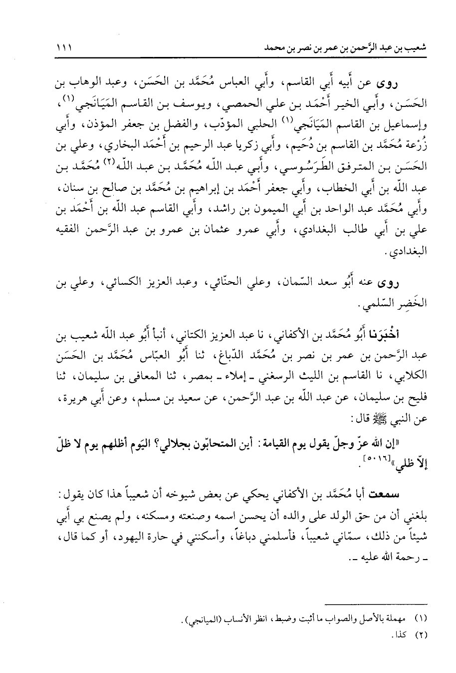 روى عن أبيه أبي القاسم وأبي العباس محمد بن الحسن وعبد الوهاب بن الحسن وأبي الخير أحمد بن علي الحمصي ويوسف بن القاسم الميانجي (1) وإسماعيل بن القاسم الميانجي الحلبي المؤدب والفضل بن جعفر المؤذن وأبي زرعة محمد بن القاسم بن دحيم وأبي زكريا عبد الرحيم بنأحمد البخاري وعلي بن الحسن بن المترفق الطرسوسي وأبي عبد الله محمد بن عبد الله (2) محمد بن عبد الله بن أبي الخطاب وأبي جعفر أحمد بن إبراهيم بن محمد بن صالح بن سنان وأبي محمد عبد الواحد بن أبي الميمون بن راشد وأبي القاسم عبد الله بن أحمد بن علي بن أبي طالب البغدادي وأبي عمرو عثمان بن عمرو بن عبد الرحمن الفقيه البغدادي روى عنه أبو سعد السمان وعلي الحنائي وعبد العزيز الكسائي وعلي بن الخضر السلمي أخبرنا أبو محمد بن الأكفاني نا عبد العزيز الكتاني أنبأ أبو عبد الله شعيب بن عبد الرحمن بن عمر بن نصر بن محمد الدباغ ثنا أبو العباس محمد بن الحسن الكلابي نا القاسم بن الليث الرسغني إملاء بمصر ثنا المعافى بن سليمان ثنا فليح بن سليمان عن عبد الله بن عبد الرحمن عن سعيد بن مسلم وعن أبي هريرة عن النبي (صلى الله عليه وسلم) قال إن الله عز وجل يقول يوم القيامة أين المتحابون بجلالي اليوم أظلهم يوم لا ظل إلا ظلي سمعت أبا محمد بن الأكفاني يحكي عن بعض شيوخه أن شعيبا هذا كان يقول بلغني أن من حق الولد على والده أن يحسن اسمه وصنعته ومسكنه ولم يصنع بي أبي شيئا من ذلك سماني شعيبا فأسلمني دباغا وأسكنني في حارة اليهود أو كما قال رحمة الله عليه