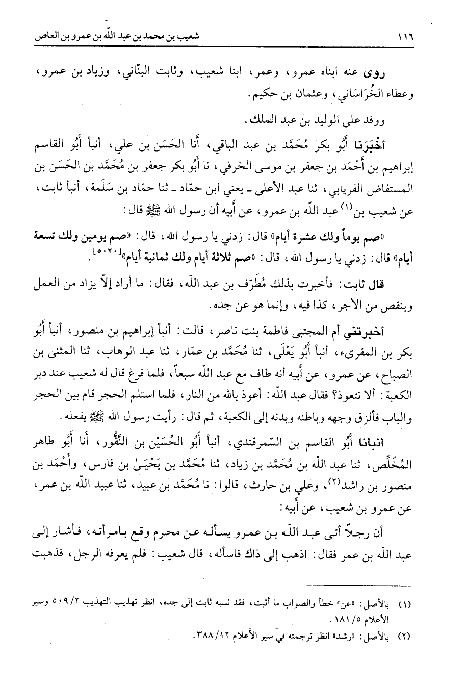 روى عنه ابناه عمرو وعمر ابنا شعيب وثابت البناني وزياد بن عمرو وعطاء الخراساني وعثمان بن حكيم ووفد على الوليد بن عبد الملك أخبرنا أبو بكر محمد بن عبد الباقي أنا الحسن بن علي أنبأ أبو القاسم إبراهيم بن أحمد بن جعفر بن موسى الخرفي نا أبو بكر جعفر بن محمد بن الحسن بن المستفاض الفريابي ثنا عبد الأعلى يعني ابن حماد ثنا حماد بن سلمة أنبأ ثابت عن شعيب بن (1) عبد الله بن عمرو عن أبيه أن رسول الله (صلى الله عليه وسلم) قال صم يوما ولك عشرة أيام قال زدني يا رسول الله قال صم يومين ولك تسعة أيام قال زدني يا رسول الله قال صم ثلاثة أيام ولك ثمانية أيام قال ثابت فأخبرت بذلك مطرف بن عبد الله فقال ما أراد إلا يزاد من العمل وينقص من الأجر كذا فيه وإنما هو عن جده أخبرتني أم المجتبى فاطمة بنت ناصر قالت أنبأ إبراهيم بن منصور أنبأ أبو بكر بن المقرئ أنبأ أبو يعلى ثنا محمد بن عمار ثنا عبد الوهاب ثنا المثنى بن الصباح عن عمرو عن أبيه أنه طاف مع عبد الله سبعا فلما فرغ قال له شعيب عند دبر الكعبة ألا نتعوذ فقال عبد الله أعوذ بالله من النار فلما استلم الحجر قام بين الحجر والباب فألزق وجهه وباطنه وبدنه إلى الكعبة ثم قال رأيت رسول الله (صلى الله عليه وسلم) يفعله أنبأنا أبو القاسم بن السمرقندي أنبأ أبو الحسين بن النقور أنا أبو طاهر المخلص ثنا عبد الله بن محمد بن زياد ثنا محمد بن يحيى بن فارس وأحمد بن منصور بن راشد (2) وعلي بن حارث قالوا نا محمد بن عبيد ثنا عبيد الله بن عمر عن عمرو بن شعيب عن أبيه ان رجلا أتى عبد الله بن عمرو يسأله عن محرم وقع بامرأته فأشار إلى عبد الله بن عمر فقال اذهب إلى ذاك فاسأله قال شعيب فلم يعرفه الرجل فذهبت