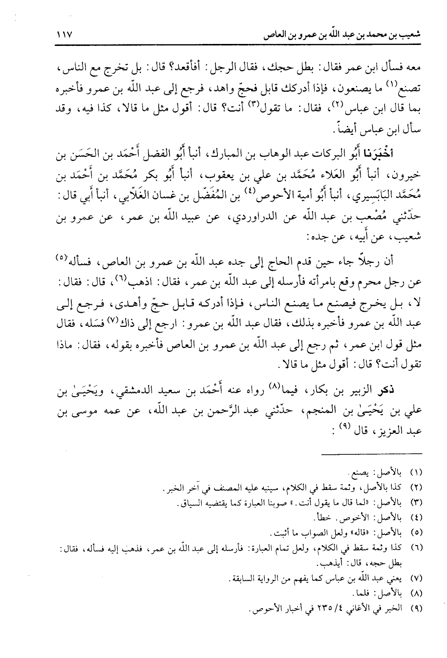معه فسأل ابن عمر فقال بطل حجك فقال الرجل أفأقعد قال بل تخرج مع الناس تصنع (1) ما يصنعون فإذا أدركك قابل فحج واهد فرجع إلى عبد الله بن عمرو فأخبره بما قال ابن عباس (2) فقال ما تقول (3) أنت قال أقول مثل ما قالا كذا فيه وقد سأل ابن عباس أيضا أخبرنا أبو البركات عبد الوهاب بن المبارك أنبأ أبو الفضل أحمد بن الحسن بن خيرون أنبأ أبو العلاء محمد بن علي بن يعقوب أنبأ أبو بكر محمد بنأحمد بن محمد البابسيري أنبأ أبو أمية الأحوص (4) بن المفضل بن غسان الغلابي أنبأأبي قال حدثني مصعب بن عبد الله عن الدراوردي عن عبيد الله بن عمر عن عمرو بن شعيب عن أبيه عن جده أن رجلا جاء حين قدم الحاج إلى جده عبد الله بن عمرو بن العاص فسأله (5) عن رجل محرم وقع بامرأته فأرسله إلى عبد الله بن عمر فقال اذهب (6) قال فقال لا بل يخرج فيصنع ما يصنع الناس فإذا أدركه قابل حج وأهدى فرجع إلى عبد الله بن عمرو فأخبره بذلك فقال عبد الله بن عمرو ارجع إلى ذاك (7) فسله فقال مثل قول ابن عمر ثم رجع إلى عبد الله بن عمرو بن العاص فأخبره بقوله فقال ماذا تقول أنت قال أقول مثل ما قالا ذكر الزبير بن بكار فيما (8) رواه عنه أحمد بن سعيد الدمشقي ويحيى بن علي بن يحيى بن المنجم حدثني عبد الرحمن بن عبد الله عن عمه موسى بن عبد العزيز قال (9)