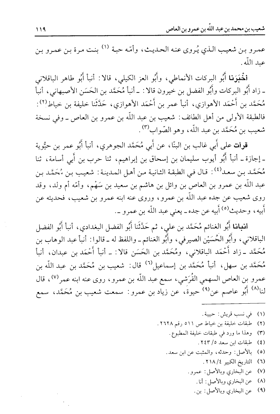 عمرو بن شعيب الذي يروى عنه الحديث وأمه حبة (1) بنت مرة بن عمرو بن عبد الله أخبرنا أبو البركات الأنماطي وأبو العز الكيلي قالا أنبأ أبو طاهر الباقلاني زاد أبو البركات وأبو الفضل بن خيرون قالا أنبأ محمد بن الحسن الأصبهاني أنبأ محمد بن أحمد الأهوازي أنبأ عمر بن أحمد الأهوازي حدثنا خليفة بن خياط فالطبقة الأولى من أهل الطائف شعيب بن عبد الله بن عمرو بن العاص وفي نسخة شعيب بن محمد بن عبد الله وهو الصواب (3) قرأت على أبي غالب بن البنا عن أبي محمد الجوهري أنبأ أبو عمر بن حيوية إجازة أنبأ أبو أيوب سليمان بن إسحاق بن إبراهيم ثنا حرب بن أبي أسامة ثنا محمد بن سعد (4) قال في الطبقة الثانية من أهل المدينة شعيب بن محمد بن عبد الله بن عمرو بن العاص بن وائل بن هاشم بن سعيد بن سهم وأمه أم ولد وقد روى شعيب عن جده عبد الله بن عمرو وروى عنه ابنه عمرو بن شعيب فحديثه عن أبيه وحديث (5) أبيه عن جده يعني عبد الله بن عمرو أنبأنا أبو الغنائم محمد بن علي ثم حدثنا أبو الفضل البغدادي أنبأ أبو الفضل الباقلاني وأبو الحسين الصيرفي وأبو الغنائم واللفظ له قالوا أنبأ عبد الوهاب بن محمد زاد أحمد الباقلاني ومحمد بن الحسن قالا أنبأ أحمد بن عبدان أنبأ محمد بن سهل أنبأ محمد بن إسماعيل (6) قال شعيب بن محمد بن عبد الله بن عمرو بن العاص السهمي القرشي سمع عبد الله بن عمرو روى عنه ابنه عمر (7) قال لنا (8) أبو عاصم عن (9) حيوة عن زياد بن عمرو سمعت شعيب بن محمد سمع