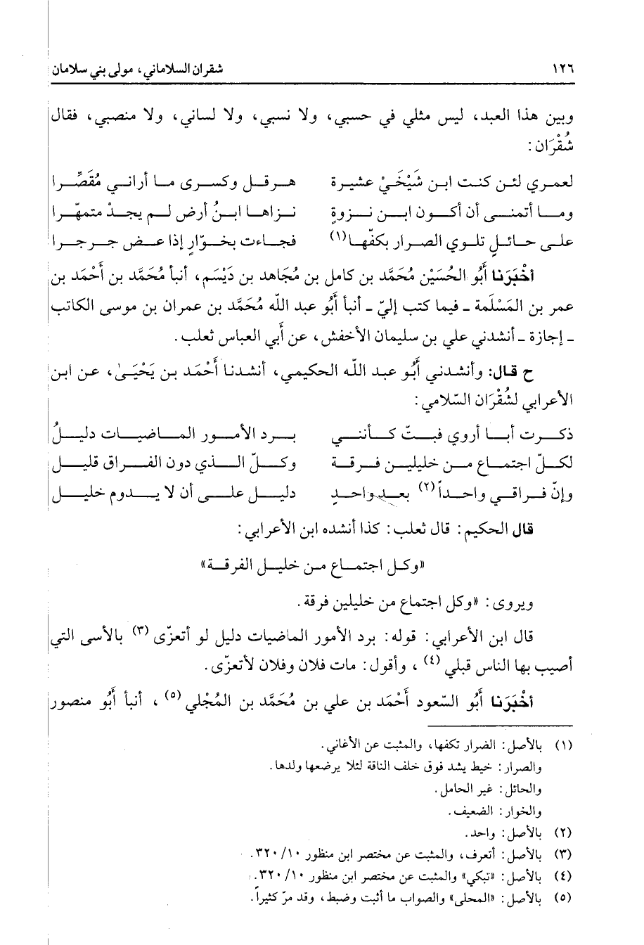 وبين هذا العبد ليس مثلي في حسبي ولا نسبي ولا لساني ولا منصبي فقال شقران * لعمري لئن كنت ابن شيخي عشيرة * هرقل وكسرى ما أراني مقصرا وما أتمنى أن أكون ابن نزوة * نزاها ابن أرض لم يجد متمهرا على حائل تلوي الصرار بكفها (1) * فجاءت بخوار إذا عض جرجرا * أخبرنا أبو الحسين محمد بن كامل بن مجاهد بن ديسم أنبأ محمد بن أحمد بن عمر بن المسلمة فيما كتب إلي أنبأ أبو عبد الله محمد بن عمران بن موسى الكاتب إجازة أنشدني علي بن سليمان الأخفش عنأبي العباس ثعلب ح قال وأنشدني أبو عبد الله الحكيمي أنشدنا أحمد بن يحيى عن ابن الأعرابي لشقران السلامي * ذكرت أبا أروي فبت كأنني * برد الأمور الماضيات دليل لكل اجتماع من خليلين فرقة * وكل الذي دون الفراق قليل وإن فراقي واحدا (2) بعد واحد * دليل على أن لا يدوم خليل * قال الحكيم قال ثعلب كذا أنشده ابن الأعرابي * وكل اجتماع من خليل الفرقة ويروى وكل اجتماع من خليلين فرقة قال ابن الأعرابي قوله برد الأمور الماضيات دليل لو أتعزى (3) بالأسى التي أصيب بها الناس قبلي (4) وأقول مات فلان وفلان لأتعزى أخبرنا أبو السعود أحمد بن علي بن محمد بن المجلي (5) أنبأ أبو منصور