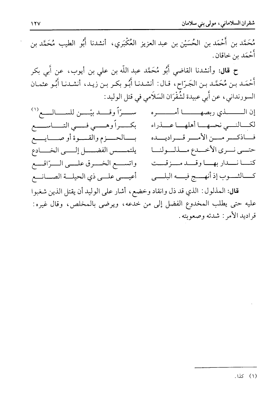 محمد بن أحمد بن الحسين بن عبد العزيز العكبري أنشدنا أبو الطيب محمد بن أحمد بن خاقان ح قال وأنشدنا القاضي أبو محمد عبد الله بن علي بن أيوب عن أبي بكر أحمد بن محمد بن الجراح قال أنشدنا أبو بكر بن زيد أنشدنا أبو عثمان السورنداني عن أبي عبيدة لشقران السلامي في قتل الوليد * إن الذي ربصها أمره * سرا وقد بين للسالع (1) لكالني نحسها أهلها عذراء * بكرا وهي في التاسع فاذكر من الأمر قراديده * بالحزم والقوة أو صايع حتى نرى الأخدع مذلولنا * يلتمس الفضل إلى الخادع كنا ندار بها وقد مزقت * واتسع الخرق على الراقع كالثوب إذ أنهج فيه البلى * أعيى على ذي الحيلة الصانع * قال المذلول الذي قد ذل وانقاد وخضع أشار على الوليد أن يقتل الذين شغبوا عليه حتى يطلب المخدوع الفضل إلى من خدعه ويرضى بالمخلص وقال غيره قراديد الأمر شدته وصعوبته