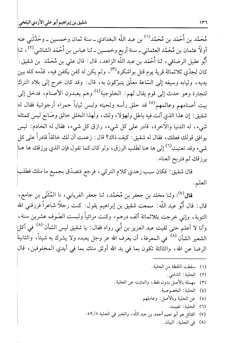 محمد بن أحمد بن محمد (1) بن عبد الله البغدادي سنة ثمان وخمسين وحدثني عنه أولا عثمان بن محمد العثماني سنة أربع وخمسين ثنا عباس بنأحمد الشاشي (2) ثنا أبو عقيل الرصافي ثنا أحمد بن عبد الله الزاهد قال قال علي بن محمد بن شقيق كان لجدي ثلاثمائة قرية يوم قتل بواشكرد (3) ولم يكن له كفن فيه قدمه كله بين يديه وثيابه وسيفه إلى الساعة معلق يتبركون به قال وقد كان خرج إلى بلاد الترك لتجارة وهو حدث إلى قوم يقال لهم الخلوجية (4) وهم يعبدون الأصنام فدخل إلى بيت أصنامهم وعالمهم (5) قد حلق رأسه ولحيته ولبس ثيابا حمراء أرجوانية فقال له شقيق إن هذا الذي أنت فيه باطل ولهؤلاء ولك لهذا الخلق خالق وصانع ليس كمثله شئ فقال له الدنيا والآخرة قادر على كل شئ رازق كل شئ له الخادم ليس يوافق قولك فعلك فقال له شقيق كيف ذاك قال زعمت أن لك خالقا قادرا على كل شئ وقد تعنيت (6) إلى ها هنا لطلب الرزق ولو كان كما تقول فإن الذي يرزقك ها هنا يرزقك ثم فتربح العناء قال شقيق فكان سبب زهدي كلام التركي فرجع فتصدق بجميع ما ملك فطلب العلم قال (7) وثنا مخلد بن جعفر بن محمد ثنا جعفر الفريابي نا المثنى بن جامع قال قال أبو عبد الله سمعت شقيق بن إبراهيم يقول كنت رجلا شاعرا فرزقني الله التوبة وإني خرجت بثلاثمائة ألف درهم وكنت مرائيا ولبست الصوف عشرين سنة وأنا لا أعلم حتى لقيت عبد العزيز بنأبي رواد فقال يا شقيق ليس الشأن في أكل الشعير الشأن (8) في المعرفة أن يعرف الله عز وجل يعبده ولا يشرك به شيئا والثانية الرضا عن الله والثالثة تكون بما في يد الله أوثق منك بما في أيدي المخلوقين قال