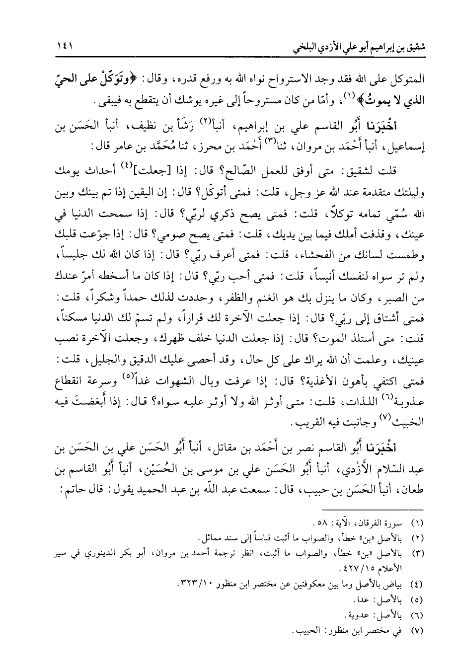 المتوكل على الله فقد وجد الاسترواح نواه الله ورفع قدره وقال " وتوكل على الحي الذي لا يموت " (1) وأما من كان مستروحا إلى غيره يوشك أن يتقطع به فيبقى أخبرنا أبو القاسم علي بن إبراهيم أنبأ (2) رشأ بن نظيف أنبأ الحسن بن إسماعيل أنبأ أحمد بن مروان ثنا (3) أحمد بن محرز ثنا محمد بن عامر قال قلت لشقيق متى أوفق للعمل الصالح قال إذا جعلت (4) أحداث يومك وليلتك متقدمة عند الله عز وجل قلت فمن أتوكل قال إن اليقين إذا تم بينك وبين الله سمي تمامه توكلا قلت فمتى يصح ذكري لربي قال إذا سمحت الدنيا في عينك وقذفت أملك فيما بين يديك قلت فمتى يصح صومي قال إذا جوعت قلبك وطمست لسانك من الفحشاء قلت فمتى أعرف ربي قال إذا كان الله لك جليسا ولم تر سواه لنفسك أنيسا قلت فمتى أحب ربي قال إذا كان ما أسخطه أمر عندك من الصبر وكان ما ينزل بك هو الغنم والظفر وحددت لذلك حمدا وشكرا قلت فمتى أشتاق إلى ربي قال إذا جعلت الآخرة لك قرارا ولم تسم لك الدنيا مسكنا قلت متى أستلذ الموت قال إذا جعلت الدنيا خلف ظهرك وجعلت الآخرة نصب عينيك وعلمت أن الله يراك على كل حال وقد أحصى عليك الدقيق والجليل قلت فمتى اكتفي بأهون الأغذية قال إذا عرفت وبال الشهوات غدا (5) وسرعة انقطاع عذوبة (6) اللذات قلت متى أوثر الله ولا أوثر عليه سواه قال إذا أبغضت فيه الخبيث (7) وجانبت فيه القريب أخبرنا أبو القاسم نصر بن أحمد بن مقاتل أنبأ أبو الحسن علي بن الحسن بن عبد السلام الأزدي أنبأ أبو الحسن علي بن موسى بن الحسين أنبأ أبو القاسم بن طعان أنبأ الحسن بن حبيب قال سمعت عبد الله بن عبد الحميد يقول قال حاتم