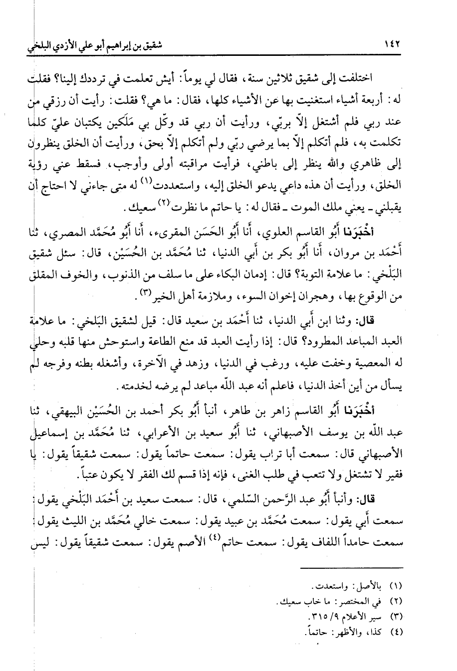 اختلفت إلى شقيق ثلاثين سنة فقال لي يوما أيش تعلمت في ترددك إلينا فقلت له أربعة أشياء استغنيت بها عن الأشياء كلها فقال ما هي فقلت رأيت أن رزقي من عند ربي فلم أشتغل إلا بربي ورأيت أن ربي قد وكل بي ملكين يكتبان علي كلما تكلمت به فلم أتكلم إلا بما يرضي ربي ولم أتكلم إلا بحق ورأيت أن الخلق ينظرون إلى ظاهري والله ينظر إلى باطني فرأيت مراقبته أولى وأوجب فسقط عني رؤية الخلق ورأيت أن هذه داعي يدعو الخلق إليه واستعددت (1) له متى جاءني لا أحتاج أن يقبلني يعني ملك الموت فقال له يا حاتم ما نظرت (2) سعيك أخبرنا أبو القاسم العلوي أنا أبو الحسن المقرئ أنا أبو محمد المصري ثنا أحمد بن مروان أنا أبو بكر بنأبي الدنيا ثنا محمد بن الحسين قال سئل شقيق البلخي ما علامة التوبة قال إدمان البكاء على ما سلف من الذنوب والخوف المقلق من الوقوع بها وهجران إخوان السوء وملازمة أهل الخير (3) قال وثناابن أبي الدنيا ثنا أحمد بن سعيد قال قيل لشقيق البلخي ما علامة العبد المباعد المطرود قال إذا رأيت العبد قد منع الطاعة واستوحش منها قلبه وحلي له المعصية وخفت عليه ورغب في الدنيا وزهد في الآخرة وأشغله بطنه وفرجه لم يسأل من أين أخذ الدنيا فاعلم أنه عبد الله مباعد لم يرضه لخدمته أخبرنا أبو القاسم زاهر بن طاهر أنبأ أبو بكر أحمد بن الحسين البيهقي ثنا عبد الله بن يوسف الأصبهاني ثنا أبو سعيد بن الأعرابي ثنا محمد بن إسماعيل الأصبهاني قال سمعت أبا تراب يقول سمعت حاتما يقول سمعت شقيقا يقول يا فقير لا تشتغل ولا تتعب في طلب الغنى فإنه إذا قسم لك الفقر لا يكون عتبا قال وأنبأ أبو عبد الرحمن السلمي قال سمعت سعيد بن أحمد البلخي يقول سمعت أبي يقول سمعت محمد بن عبيد يقول سمعت خالي محمد بن الليث يقول سمعت حامدا اللفاف يقول سمعت حاتم (4) الأصم يقول سمعت شقيقا يقول ليس