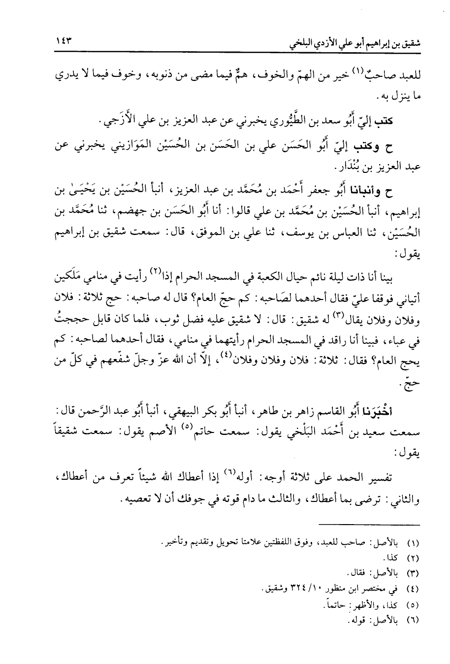 للعبد صاحب (1) خير من الهم والخوف هم فيما مضى من ذنوبه وخوف فيما لا يدري ما ينزل به كتب إلي أبو سعد بن الطيوري يخبرني عن عبد العزيز بن علي الأزجي ح وكتب إلي أبو الحسن علي بن الحسن بن الحسين الموازيني يخبرني عن عبد العزيز بن بندار ح وأنبأنا أبو جعفر أحمد بن محمد بن عبد العزيز أنبأ الحسين بن يحيى بن إبراهيم أنبأ الحسين بن محمد بن علي قالوا أنا أبو الحسن بن جهضم ثنا محمد بن الحسين ثنا العباس بن يوسف ثنا علي بن الموفق قال سمعت شقيق بن إبراهيم يقول بينا أنا ذات ليلة نائم حيال الكعبة في المسجد الحرام إذا (2) رأيت في منامي ملكين أتياني فوقفا علي فقال أحدهما لصاحبه كم حج العام قال له صاحبه حج ثلاثة فلان وفلان وفلان يقال (3) له شقيق قال لا شقيق عليه فضل ثوب فلما كان قابل حججت في عباء فبينا أنا راقد في المسجد الحرام رأيتهما في منامي فقال أحدهما لصاحبه كم يحج العام فقال ثلاثة فلان وفلان وفلان (4) إلا أن الله عز وجل شفعهم في كل من حج أخبرنا أبو القاسم زاهر بن طاهر أنبأ أبو بكر البيهقي أنبأ أبو عبد الرحمن قال سمعت سعيد بن أحمد البلخي يقول سمعت حاتم (5) الأصم يقول سمعت شقيقا يقول تفسير الحمد على ثلاثة أوجه أوله (6) إذا أعطاك الله شيئا تعرف من أعطاك والثاني ترضى بما أعطاك والثالث ما دام قوته في جوفك أن لا تعصيه