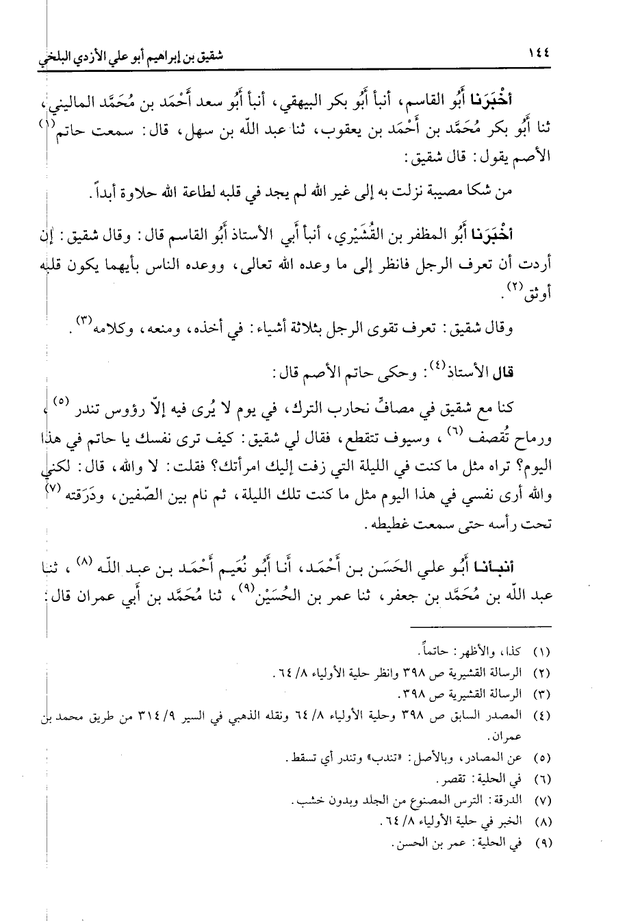 أخبرنا أبو القاسم أنبأ أبو بكر البيهقي أنبأ أبو سعد أحمد بن محمد الماليني ثنا أبو بكر محمد بن أحمد بن يعقوب ثنا عبد الله بن سهل قال سمعت حاتم (1) الأصم يقول قال شقيق من شكا مصيبة نزلت به إلى غير الله لم يجد في قلبه لطاعة الله حلاوة أبدا أخبرنا أبو المظفر بن القشيري أنبأأبي الأستاذ أبو القاسم قال وقال شقيق إن أردت أن تعرف الرجل فانظر إلى ما وعده الله تعالى ووعده الناس بأيهما يكون قلبه أوثق (2) وقال شقيق تعرف تقوى الرجل بثلاثة اشياء في أخذه ومنعه وكلامه (3) قال الأستاذ (4) وحكى حاتم الأصم قال كنا مع شقيق في مصاف نحارب الترك في يوم لا يرى فيه إلا رؤوس تندر (5) ورماح تقصف (6) وسيوف تتقطع فقال لي شقيق كيف ترى نفسك يا حاتم في هذا اليوم تراه مثل ما كنت في الليلة التي زفت إليك امرأتك فقلت لا والله قال لكني والله أرى نفسي في هذا اليوم مثل ما كنت تلك الليلة ثم نام بين الصفين ودرقته (7) تحت رأسه حتى سمعت غطيطه أنبأنا أبو علي الحسن بن أحمد أنا أبو نعيم أحمد بن عبد الله (8) ثنا عبد الله بن محمد بن جعفر ثنا عمر بن الحسين (9) ثنا محمد بن أبي عمران قال