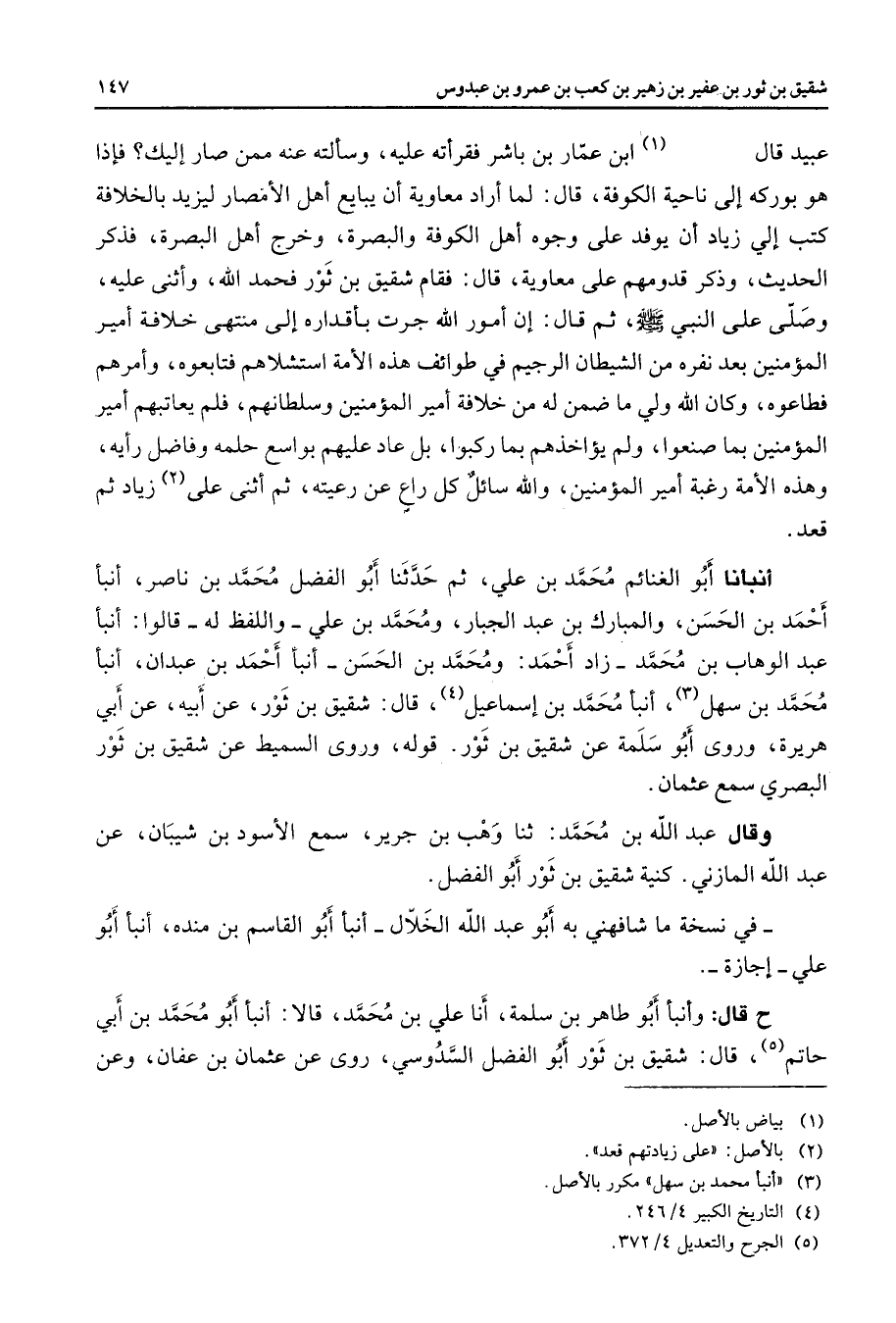 عبيد قال (1) ابن عمار بن باشر فقرأته عليه وسألته عنه ممن صار إليك فإذا هو بوركه إلى ناحية الكوفة قال لما أراد معاوية أن يبايع أهل الأمصار ليزيد بالخلافة كتب إلى زياد أن يوفد على وجوه أهل الكوفة والبصرة وخرج أهل البصرة فذكر الحديث وذكر قدومهم على معاوية قال فقام شقيق بن ثور فحمد الله وأثنى عليه وصلى على النبي (صلى الله عليه وسلم) ثم قال إن أمور الله جرت بأقداره إلى منتهى خلافة أمير المؤمنين بعد نفره من الشيطان الرجيم في طوائف هذه الأمة استشلاهم فتابعوه وأمرهم فطاعوه وكان الله ولي ما ضمن له من خلافة أمير المؤمنين وسلطانهم فلم يعاتبهم أمير المؤمنين بما صنعوا ولم يؤاخذهم بما ركبوا بل عاد عليهم بواسع حلمه وفاضل رأيه وهذه الأمة رغبة أمير المؤمنين والله سائل كل راع عن رعيته ثم أثنى على (2) زياد ثم قعد أنبأنا أبو الغنائم محمد بن علي ثم حدثنا أبو الفضل محمد بن ناصر أنبأ أحمد بن الحسن والمبارك بن عبد الجبار ومحمد بن علي واللفظ له قالوا أنبأ عبد الوهاب بن محمد زاد أحمد ومحمد بن الحسن أنبأ أحمد بن عبدان أنبأ محمد بن سهل (3) أنبأ محمد بن إسماعيل (4) قال شقيق بن ثور عن أبيه عنأبي هريرة وروى أبو سلمة عن شقيق بن ثور قوله وروى السميط عن شقيق بن ثور البصري سمع عثمان وقال عبد الله بن محمد ثنا وهب بن جرير سمع الأسود بن شيبان عن عبد الله المازني كنية شقيق بن ثور أبو الفضل في نسخة ما شافهني به أبو عبد الله الخلال أنبأ أبو القاسم بن منده أنبأ أبو علي إجازة ح قال وأنبأ أبو طاهر بن سلمة أنا علي بن محمد قالا أنبأ أبو محمد بن أبي (5) حاتم قال شقيق بن ثور أبو الفضل السدوسي روى عن عثمان بن عفان وعن