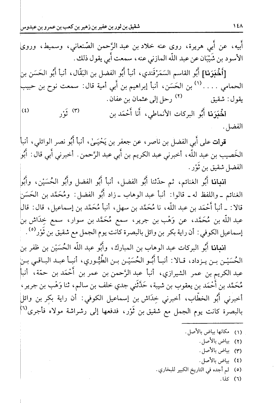 أبيه عنأبي هريرة روى عنه خلاد بن عبد الرحمن الصنعاني وسميط وروى الأسود بن شيبان عن عبد الله المازني عنه سمعت أبي يقول ذلك أخبرنا أبو القاسم السمرقندي أنبأ أبو الفضل بن البقال أنبأ أبو الحسن بن الحمامي (1) بن الحسن أنبأ إبراهيم بن أبي أمية قال سمعت نوح بن حبيب يقول شقيق (2) رحل إلى عثمان بن عفان أخبرنا أبو البركات الأنماطي أنا أحمد بن (3) ثور (4) الفضل قرأت على أبي الفضل بن ناصر عن جعفر بن يحيى أنبأ أبو نصر الوائلي أنبأ الخصيب بن عبد الله أخبرني عبد الكريم بنأبي عبد الرحمن أخبرني أبي قال أبو الفضل شقيق بن ثور (5) أنبأنا أبو الغنائم ثم حدثنا أبو الفضل أنبأ أبو الفضل وأبو الحسين وأبو الغنائم واللفظ له قالوا أنبأ عبد الوهاب زاد أبو الفضل ومحمد بن الحسن قالا أنبأ أحمد بن عبد الله نا محمد بن سهل أنبأ محمد بن إسماعيل قال قال عبد الله بن محمد عن وهب بن جرير سمع محمد بن سوار سمع خداش بن إسماعيل الكوفي أن راية بكر بن وائل بالبصرة كانت يوم الجمل مع شقيق بن ثور أنبأنا أبو البركات عبد الوهاب بن المبارك وأبو عبد الله الحسين بن ظفر بن الحسين بن يزداد قالا أنبا أبو الحسين بن الطيوري أنبأ عبد الباقي بن عبد الكريم بن عمر الشيرازي أنبأ عبد الرحمن بن عمر بن أحمد بن حمة أنبأ محمد بن أحمد بن يعقوب بن شيبة حدثني جدي خلف بن سالم ثنا وهب بن جرير أخبرني أبو الخطاب أخبرني خداش بن إسماعيل الكوفي أن راية بكر بن وائل بالبصرة كانت يوم الجمل مع شقيق بن ثور فدفعها إلى رشراشة مولاه فأجرى (6)