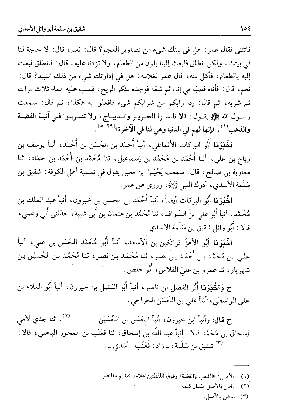 فائتني فقال عمر هل في بيتك شئ من تصاوير العجم قال نعم قال لا حاجة لنا في بيتك ولكن انطلق فابعث إلينا بلون من الطعام ولا تزدنا عليه قال فانطلق فبعث إليه بالطعام فأكل منه قال عمر لغلامه هل في إداوتك شئ من ذلك النبيذ قال نعم قال فأتاه فصبه في إناء ثم شمه فوجده منكر الريح فصب عليه الماء ثلاث مرات ثم شربه ثم قال إذا رابكم من شرابكم شئ فافعلوا به هكذا ثم قال سمعت رسول الله (صلى الله عليه وسلم) يقول لا تلبسوا الحرير والديباج ولا تشربوا في آنية الفضة والذهب (1) فإنها لهم في الدنيا وهي لنا في الآخرة أخبرنا أبو البركات الأنماطي أنبأ أحمد بن الحسن بن أحمد أنبأ يوسف بن رباح بن علي أنبأ أحمد بن محمد بن إسماعيل ثنا محمد بن أحمد بن حماد ثنا معاوية بن صالح قال سمعت يحيى بن معين يقول في تسمية أهل الكوفة شقيق بن سلمة الأسدي أدرك النبي (صلى الله عليه وسلم) وروى عن عمر أخبرنا أبو البركات أيضا أنبأ أحمد بن الحسن بن خيرون أنبأ عبد الملك بن محمد أنبأ أبو علي بن الصواف ثنا محمد بن عثمان بنأبي شيبة حدثني أبي وعمي قالا أبو وائل شقيق بن سلمة الأسدي أخبرنا أبو الأعز قراتكين بن الأسعد أنبأ أبو محمد الحسن بن علي أنبأ علي بن محمد بنأحمد بن نصر ثنا محمد بن نصر ثنا محمد بن الحسين بن شهريار ثنا عمرو بن علي الفلاس أبو حفص ح وأخبرنا أبو الفضل بن ناصر أنبأ أبو الفضل بن خيرون أنبأ أبو العلاء بن علي الواسطي أنبأ علي بن الحسن الجراحي ح قال وأنبأ ابن خيرون أنبأ الحسن بن الحسين (2) ثنا جدي لأمي إسحاق بن محمد قالا أنبأ عبد الله بن إسحاق ثنا قعنب بن المحور الباهلي قالا (3) شقيق بن سلمة زاد قعنب أسدي