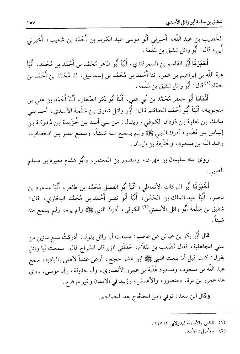 الخصيب بن عبد الله أخبرني أبو موسى عبد الكريم بن أحمد بن شعيب أخبرني أبي قال أبو وائل شقيق بن سلمة أخبرنا أبو القاسم بن السمرقندي أنبأ أبو طاهر محمد بن أحمد بن محمد أنبأ هبة الله بن إبراهيم بن عمر ثنا أحمد بن محمد بن إسماعيل ثنا محمد بن أحمد بن حماد (1) قال أبو وائل شقيق بن سلمة أنبأنا أبو جعفر محمد بن أبي علي أنبأ أبو بكر الصفار أنبأ أحمد بن علي بن منجوية أنبأ أبو أحمد الحاكم قال أبو وائل شقيق بن سلمة الأسدي أحد بني مالك بن ثعلبة بن ذودان الكوفي ويقال من بني أسد بن خزيمة بن مدركة بن إلياس بن مضر أدرك النبي (صلى الله عليه وسلم) ولم يسمع منه شيئا وسمع عمر بن الخطاب وعبد الله بن مسعود وحذيفة بن اليمان روى عنه سليمان بن مهران ومنصور بن المعتمر وأبو هشام مغيرة بن مسلم الضبي أخبرنا أبو البركات الأنماطي أنبأ أبو الفضل محمد بن طاهر أنبأ مسعود بن ناصر أنبأ عبد الملك بن الحسن أنبأ أبو نصر أحمد بن محمد البخاري قال شقيق بن سلمة أبو وائل الأسدي الكوفي أدرك النبي (صلى الله عليه وسلم) ولم يره ولم يسمع منه شيئا قال أبو بكر بن عياش عن عاصم سمعت أبا وائل يقول أدركت سبع سنين من سني الجاهلية فقال مصعب بن سلام حدثني الزبرقان السراج قال سمعت أبا وائل يقول كنت قبل أن يبعث النبي (صلى الله عليه وسلم) ابن عشر حجج أرعى غنما لأهلي بالبادية سمع عبد الله بن مسعود ومسعود عقبة بن عمرو الأنصاري وأبا حذيفة وأبا موسى روى عنه عمرو بن مرة ومنصور والأعمش وزبيد في الإيمان وغير موضع وقال ابن سعد توفي زمن الحجاج بعد الجماجم