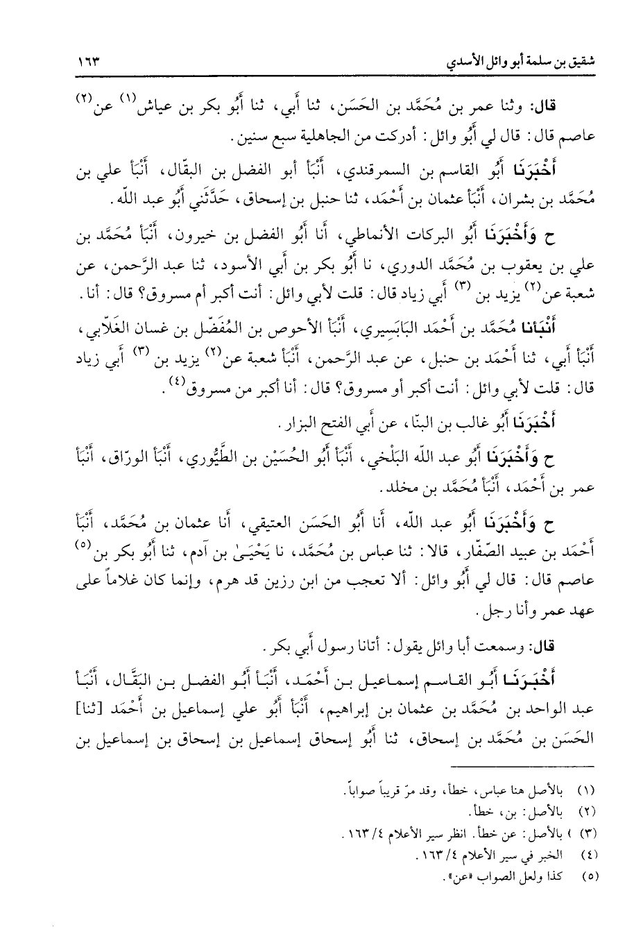 قال وثنا عمر بن محمد بن الحسن ثنا أبي ثنا أبو بكر بن عياش (1) عن (2) عاصم قال قال لي أبو وائل أدركت من الجاهلية سبع سنين أخبرنا أبو القاسم بن السمرقندي أنبأ أبو الفضل بن البقال أنبأ علي بن محمد بن بشران أنبأ عثمان بن أحمد ثنا حنبل بن إسحاق حدثني أبو عبد الله ح وأخبرنا أبو البركات الأنماطي أنا أبو الفضل بن خيرون أنبأ محمد بن علي بن يعقوب بن محمد الدوري نا أبو بكر بنأبي الأسود ثنا عبد الرحمن عن شعبة عن (2) يزيد (3) بن أبي زياد قال قلت لأبي وائل أنت أكبر أم مسروق قال أنا أنبأنا محمد بن أحمد البابسيري أنبأ الأحوص بن المفضل بن غسان الغلابي أنبأ أبي ثنا أحمد بن حنبل عن عبد الرحمن أنبأ شعبة عن يزيد بن أبي زياد قال قلت لأبي وائل أنت أكبر أو مسروق قال أنا أكبر من مسروق (4) أخبرنا أبو غالب بن البنا عن أبي الفتح البزار ح وأخبرنا أبو عبد الله البلخي أنبأ أبو الحسين بن الطيوري أنبأ الوراق أنبأ عمر بن أحمد أنبأ محمد بن مخلد ح وأخبرنا أبو عبد الله أنا أبو الحسن العتيقي أنا عثمان بن محمد أنبأ أحمد بن عبيد الصفار قالا ثنا عباس بن محمد نا يحيى بن آدم ثنا أبو بكر بن (5) عاصم قال قال لي أبو وائل ألا تعجب من ابن رزين قد هرم وإنما كان غلاما على عهد عمر وأنا رجل قال وسمعت أبا وائل يقول أتانا رسول أبي بكر أخبرنا أبو القاسم إسماعيل بن أحمد أنبأ أبو الفضل بن البقال أنبأ عبد الواحد بن محمد بن عثمان بن إبراهيم أنبأ أبو علي إسماعيل بن أحمد ثنا الحسن بن محمد بن إسحاق ثنا أبو إسحاق إسماعيل بن إسحاق بن إسماعيل بن
