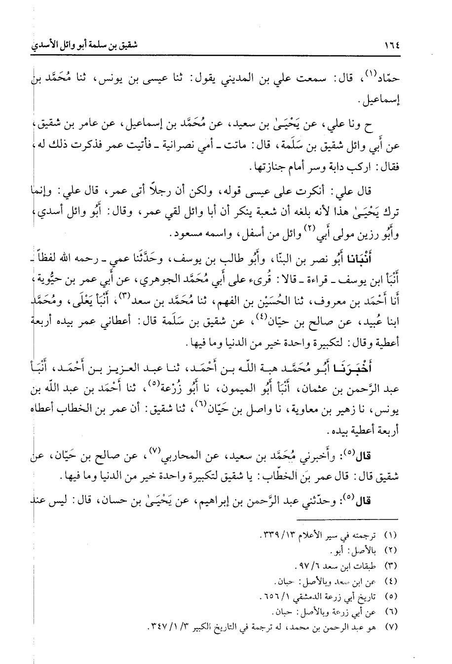 حماد (1) قال سمعت علي بن المديني يقول ثنا عيسى بن يونس ثنا محمد بن إسماعيل ح ونا علي عن يحيى بن سعيد عن محمد بن إسماعيل عن عامر بن شقيق عن أبي وائل شقيق بن سلمة قال ماتت أمي نصرانية فأتيت عمر فذكرت ذلك له فقال اركب دابة وسر أمام جنازتها قال علي أنكرت على عيسى قوله ولكن أن رجلا أتى عمر قال علي وإنما ترك يحيى هذا لأنه بلغه أن شعبة ينكر أن أبا وائل لقي عمر وقال أبو وائل أسدي وأبو رزين مولى أبي (2) وائل من أسفل واسمه مسعود أنبأنا أبو نصر بن البنا وأبو طالب بن يوسف وحدثنا عمي رحمه الله لفظا أنبأ ابن يوسف قراءة قالا قرئ على أبي محمد الجوهري عن أبي عمر بن حيوية أنا أحمد بن معروف ثنا الحسين بن الفهم ثنا محمد بن سعد (3) أنبأ يعلى ومحمد ابنا عبيد عن صالح بن حيان (4) عن شقيق بن سلمة قال أعطاني عمر بيده أربعة أعطية وقال لتكبيرة واحدة خير من الدنيا وما فيها أخبرنا أبو محمد هبة الله بن أحمد ثنا عبد العزيز بن أحمد أنبأ عبد الرحمن بن عثمان أنبأ أبو الميمون نا أبو زرعة (5) ثنا أحمد بن عبد الله بن يونس نا زهير بن معاوية نا واصل بن حيان (6) ثنا شقيق أن عمر بن الخطاب أعطاه أربعة أعطية بيده قال (5) وأخبرني محمد بن سعيد عن المحاربي (7) عن صالح بن حيان عن شقيق قال قال عمر بن الخطاب يا شقيق لتكبيرة واحدة خير من الدنيا وما فيها قال وحدثني عبد الرحمن بن إبراهيم عن يحيى بن حسان قال ليس عند