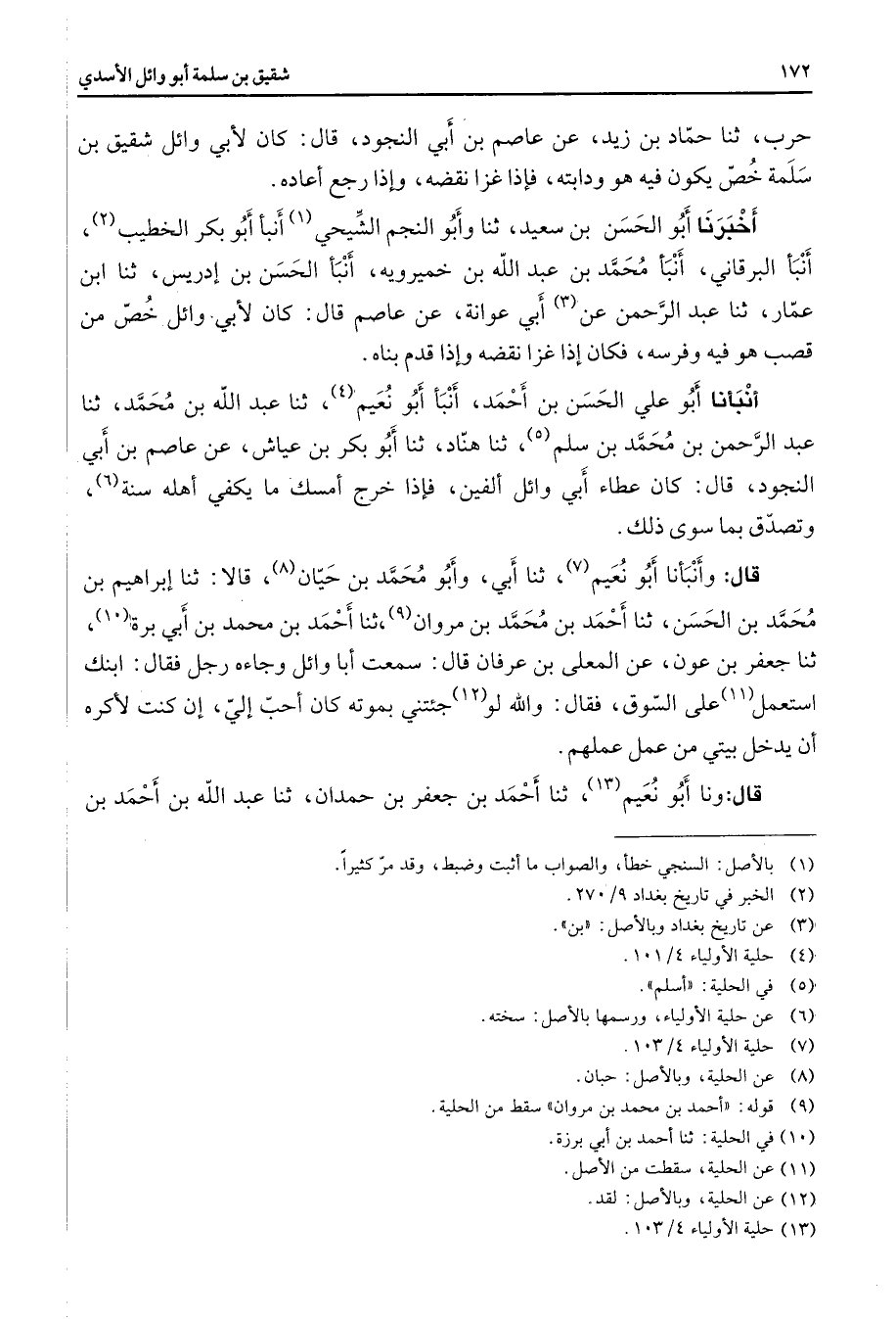 حرب ثنا حماد بن زيد عن عاصم بن أبي النجود قال كان لأبي وائل شقيق بن سلمة خص يكون فيه هو ودابته فإذا غزا نقضه وإذا رجع أعاده أخبرنا أبو الحسن بن سعيد ثنا وأبو النجم الشيحي (1) أنبأ أبو بكر الخطيب (2) أنبأ البرقاني أنبأ محمد بن عبد الله بن خميرويه أنبأ الحسن بن إدريس ثنا ابن عمار ثنا عبد الرحمن عن (3) أبي عوانة عن عاصم قال كان لأبي وائل خص من قصب هو فيه وفرسه فكان إذا غزا نقضه وإذا قدم بناه أنبأنا أبو علي الحسن بن أحمد أنبأ أبو نعيم (4) ثنا عبد الله بن محمد ثنا عبد الرحمن بن محمد بن سلم (5) ثنا هناد ثنا أبو بكر بن عياش عن عاصم بن أبي النجود قال كان عطاء أبي وائل ألفين فإذا خرج أمسك ما يكفي أهله سنة وتصدق بما سوى ذلك قال وأنبأنا أبو نعيم (7) ثنا أبي وأبو محمد بن حيان (8) قالا إبراهيم بن محمد بن الحسن ثنا أحمد بن محمد بن مروان (9) ثنا أحمد بن محمد بنأبي برة (10) ثنا جعفر بن عون عن المعلى بن عرفان قال سمعت أبا وائل وجاءه رجل فقال ابنك استعمل (11) على السوق فقال والله (12) جئتني بموته كان أحب إلي إن كنت لأكره أن يدخل بيتي من عمل عملهم قال ونا أبو نعيم ثنا أحمد بن جعفر بن حمدان ثنا عبد الله بنأحمد بن