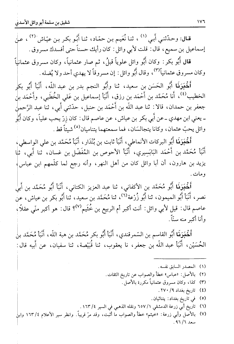قال وحدثني أبي (1) ثنا نعيم بن حماد ثنا أبو بكر بن عياش (2) عن إسماعيل بن سميع قال قلت لأبي وائل كان رأيك حسنا حتى أفسدك مسروق قال أبو بكر وكان أبو وائل علويا قبل ثم صار عثمانيا وكان مسروق عثمانيا وكان مسروق عثمانيا (3) وقال أبو وائل إن مسروقا لا يهدي أحد ولا يضله أخبرنا أبو الحسن بن سعيد ثنا وأبو النجم بدر بن عبد الله أنبأ أبو بكر الخطيب (4) أنا محمد بن أحمد بن رزق أنبأ إسماعيل بن علي الخطبي وأحمد بن جعفر بن حمدان قالا ثنا عبد الله بن أحمد بن حنبل حدثني أبي ثنا عبد الرحمن يعني ابن مهدي عن أبي بكر بن عياش عن عاصم قال كان زر يحب عليا وكان أبو وائل يحب عثمان وكانا يتجالسان فما سمعتهما يتناميان (5) شيئا قط أخبرنا أبو البركات الأنماطي أنبأ ثابت بن بندار أنبأ محمد بن علي الواسطي أنبأ محمد بن أحمد البابسيري أنبأ الأحوص بن المفضل بن غسان ثنا أبي ثنا يزيد بن هارون أن أبا وائل كان من أهل النهر وأنه رجع لما كلمهم ابن عباس ومات أخبرنا أبو محمد بن الأكفاني ثنا عبد العزيز الكتاني أنبأ أبو محمد بن أبي نصر أنبأ أبو الميمون ثنا أبو زرعة (6) ثنا محمد بن سعيد ثنا أبو بكر بن عياش عن عاصم قال قيل لأبي وائل أنت أكبر أم الربيع بن خثيم (7) قال هو أكبر مني عقلا وأنا أكبر منه سنا أخبرنا أبو القاسم بن السمرقندي أنبأ أبو بكر محمد بن هبة الله أنبأ محمد بن الحسين أنبأ عبد الله بن جعفر نا يعقوب ثنا قبيصة ثنا سفيان عنأبيه قال