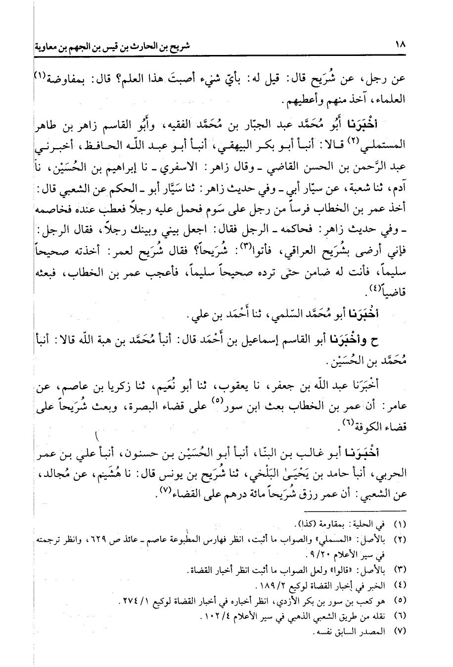 عن رجل عن شريح قال قيل له بأي شئ أصبت هذا العلم قال بمفاوضة (1) العلماء آخذ منهم وأعطيهم أخبرنا أبو محمد عبد الجبار بن محمد الفقيه وأبو القاسم زاهر بن طاهر المستملي (2) قالا أنبأ أبو بكر البيهقي أنبأ أبو عبد الله الحافظ أخبرني عبد الرحمن بن الحسن القاضي وقال زاهر الاسفري نا إبراهيم بن الحسين نا آدم ثنا شعبة عن سيار أبي وفي حديث زاهر ثنا سيار أبو الحكم عن الشعبي قال أخذ عمر بن الخطاب فرسا من رجل على سوم فحمل عليه رجلا فعطب عنده فخاصمه وفي حديث زاهر فحاكمه الرجل فقال اجعل بيني وبينك رجلا فقال الرجل فإني أرضى بشريح العراقي فأتوا (3) شريحا فقال شريح لعمر أخذته صحيحا سليما فأنت له ضامن حتى ترده صحيحا سليما فأعجب عمر بن الخطاب فبعثه قاضيا (4) أخبرنا أبو محمد السلمي ثنا أحمد بن علي ح وأخبرنا أبو القاسم إسماعيل بن أحمد قال أنبأ محمد بن هبة الله قالا أنبأ محمد بن الحسين أخبرنا عبد الله بن جعفر نا يعقوب ثنا أبو نعيم ثنا زكريا بن عاصم عن عامر أن عمر بن الخطاب بعث ابن سور (5) على قضاء البصرة وبعث شريحا على قضاء الكوفة (6) أخبرنا أبو غالب بن البنا أنبأ أبو الحسين بن حسنون أنبأ علي بن عمر الحربي أنبأ حامد بن يحيى البلخي ثنا شريح بن يونس قال نا هشيم عن مجالد عن الشعبي أن عمر رزق شريحا مائة درهم على القضاء (7)
