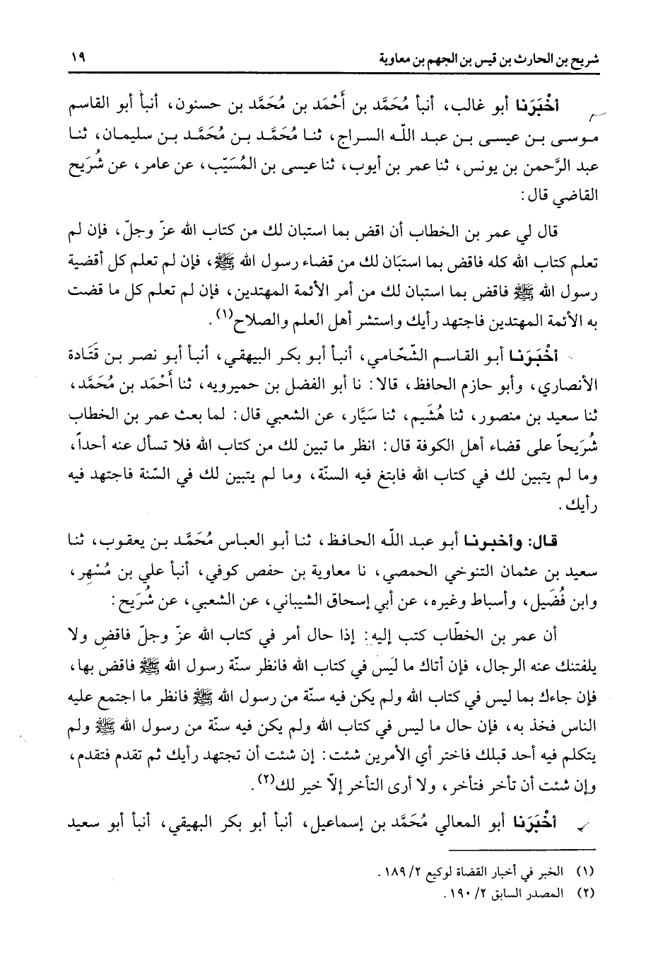 أخبرنا أبو غالب أنبأ محمد بن أحمد بن محمد بن حسنون أنبأ أبو القاسم موسى بن عيسى بن عبد الله السراج ثنا محمد بن محمد بن سليمان ثنا عبد الرحمن بن يونس ثنا عمر بن أيوب ثنا عيسى بن المسيب عن عامر عن شريح القاضي قال قال لي عمر بن الخطاب أن اقض بما استبان لك من كتاب الله عز وجل فإن لم تعلم كتاب الله كله فاقض بما استبان لك من قضاء رسول الله (صلى الله عليه وسلم) فإن لم تعلم كل أقضية رسول الله (صلى الله عليه وسلم) فاقض بما استبان لك من أمر الأئمة المهتدين فإن لم تعلم كل ما قضت به الأئمة المهتدين فاجتهد رأيك واستشر أهل العلم والصلاح (1) أخبرنا أبو القاسم الشحامي أنبأ أبو بكر البيهقي أنبأ أبو نصر بن قتادة الأنصاري وأبو حازم الحافظ قالا نا أبو الفضل بن حميرويه ثنا أحمد بن محمد ثنا سعيد بن منصور ثنا هشيم ثنا سيار عن الشعبي قال لما بعث عمر بن الخطاب شريحا على قضاء أهل الكوفة قال انظر ما تبين لك من كتاب الله فلا تسأل عنه أحدا وما لم يتبين لك في كتاب الله فابتغ فيه السنة وما لم يتبين لك في السنة فاجتهد فيه رأيك قال وأخبرنا أبو عبد الله الحافظ ثنا أبو العباس محمد بن يعقوب ثنا سعيد بن عثمان التنوخي الحمصي نا معاوية بن حفص كوفي أنبأ علي بن مسهر وابن فضيل وأسباط وغيره عن أبي إسحاق الشيباني عن الشعبي عن شريح أن عمر بن الخطاب كتب إليه إذا حال أمر في كتاب الله عز وجل فاقض ولا يلفتنك عنه الرجال فإن أتاك ما ليس في كتاب الله فانظر سنة رسول الله (صلى الله عليه وسلم) فاقض بها فإن جاءك بما ليس في كتاب الله ولم يكن فيه سنة من رسول الله (صلى الله عليه وسلم) فانظر ما اجتمع عليه الناس فخذ به فإن حال ما ليس في كتاب الله ولم يكن فيه سنة من رسول الله (صلى الله عليه وسلم) ولم يتكلم فيه أحد قبلك فاختر أي الأمرين شئت إن شئت أن تجتهد رأيك ثم تقدم فتقدم وإن شئت أن تأخر فتأخر ولا أرى التأخر إلا خير لك (2) أخبرنا أبو المعالي محمد بن إسماعيل أنبأ أبو بكر البيهقي أنبأ أبو سعيد