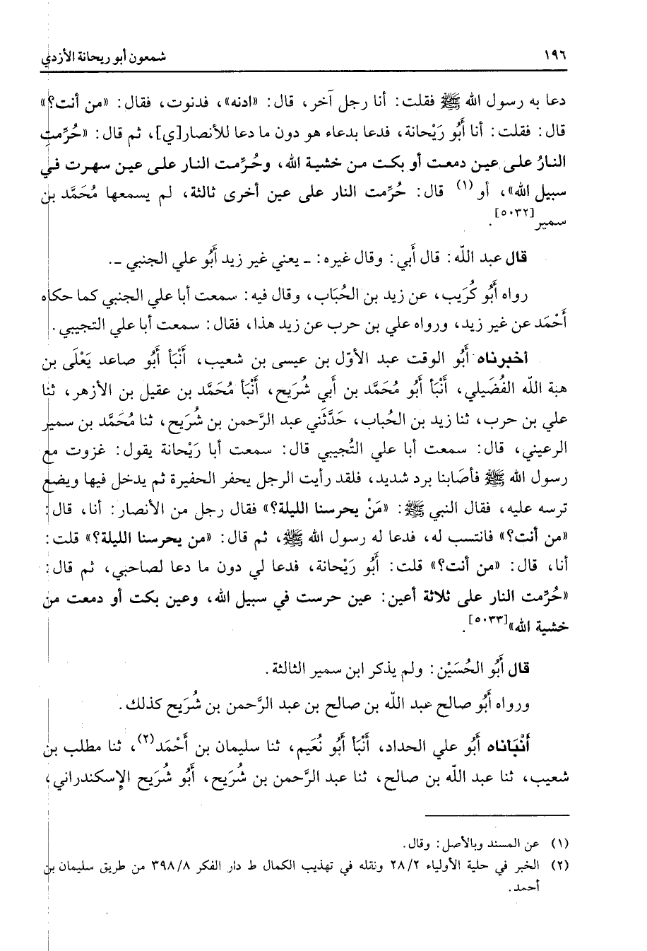 دعا به رسول الله (صلى الله عليه وسلم) فقلت أنا رجل آخر قال ادنه فدنوت فقال من أنت قال فقلت أنا أبو ريحانة فدعا بدعاء هو دون ما دعا للأنصاري ثم قال حرمت النار على عين دمعت أبو بكت من خشية الله وحرمت النار على عين سهرت في سبيل الله أو (1) قال حرمت النار على عين أخرى ثالثة لم يسمعها محمد بن سمير قال عبد الله قال أبي وقال غيره يعني غير زيد أبو علي الجنبي رواه أبو كريب عن زيد بن الحباب وقال فيه سمعت أبا علي الجنبي كما حكاه أحمد عن غير زيد ورواه علي بن حرب عن زيد هذا فقال سمعت أبا علي التجيبي أخبرناه أبو الوقت عبد الأول بن عيسى بن شعيب أنبأ أبو صاعد يعلى بن هبة الله الفضيلي أنبأ أبو محمد بن أبي شريح أنبأ محمد بن عقيل بن الأزهر ثنا علي بن حرب ثنا زيد بن الحباب حدثني عبد الرحمن بن شريح ثنا محمد بن سمير الرعيني قال سمعت أبا علي التجيبي قال سمعت أبا ريحانة يقول غزوت مع رسول الله (صلى الله عليه وسلم) فأصابنا برد شديد فلقد رأيت الرجل يحفر الحفيرة ثم يدخل فيها ويضع ترسه عليه فقال النبي (صلى الله عليه وسلم) من يحرسنا الليلة فقال رجل من الأنصار أنا قال من أنت فانتسب له فدعا له رسول الله (صلى الله عليه وسلم) ثم قال من يحرسنا الليلة قلت أنا قال من أنت قلت أبو ريحانة فدعا لي دون ما دعا لصاحبي ثم قال حرمت النار على ثلاثة أعين عين حرست في سبيل الله وعين بكت أو دمعت من خشية الله قال أبو الحسين ولم يذكر ابن سمير الثالثة ورواه أبو صالح عبد الله بن صالح بن عبد الرحمن بن شريح كذلك أنبأناه أبو علي الحداد أنبأ أبو نعيم ثنا سليمان بن أحمد (2) ثنا مطلب بن شعيب ثنا عبد الله بن صالح ثنا عبد الرحمن بن شريح أبو شريح الإسكندراني