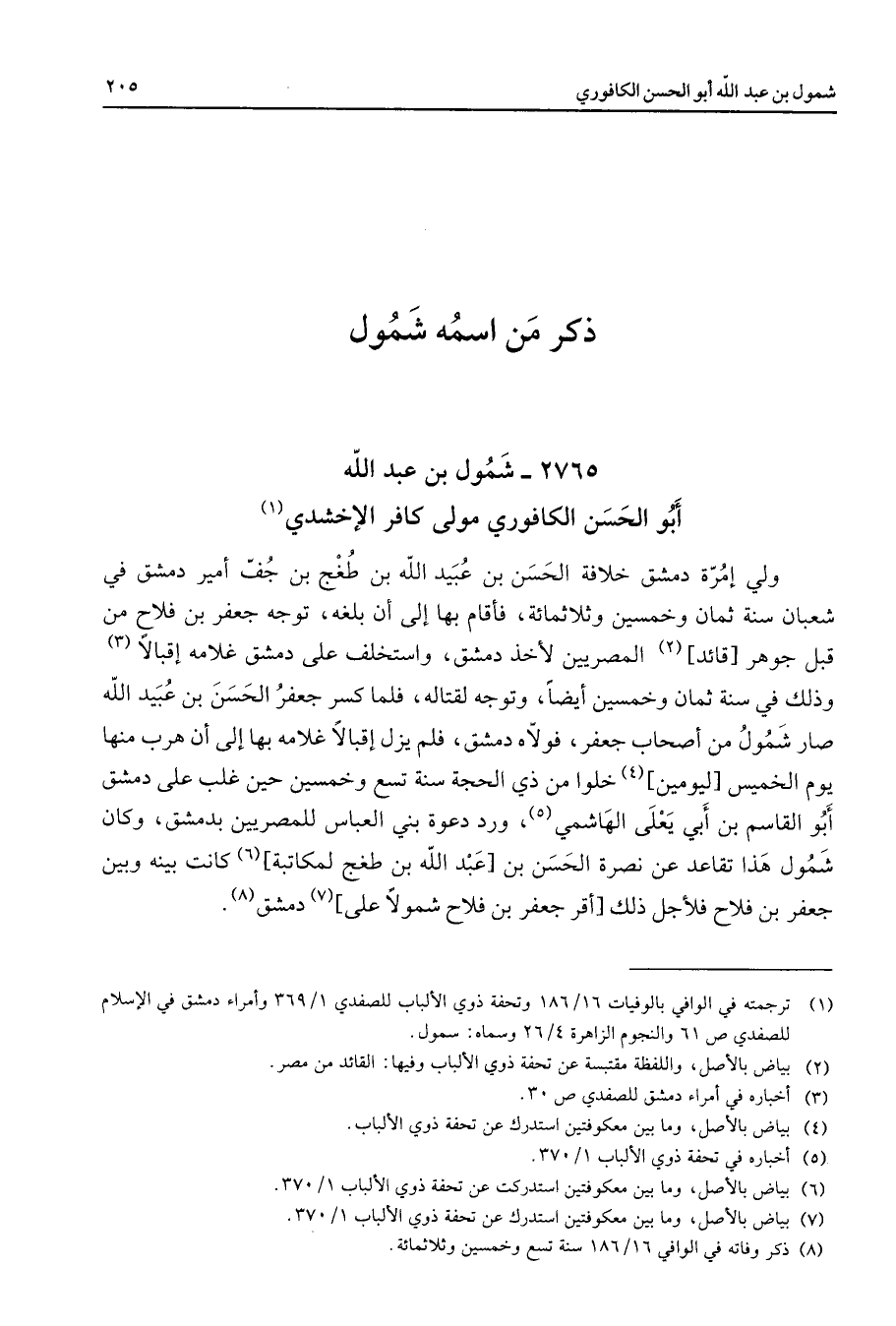 (1) ترجمته في الوافي بالوفيات 16 / 186 وتحفة ذوي الألباب للصفدي 1 / 369 وأمراء دمشق في الإسلام للصفدي ص 61 والنجوم الزاهرة 4 / 26 وسماه: سمول
