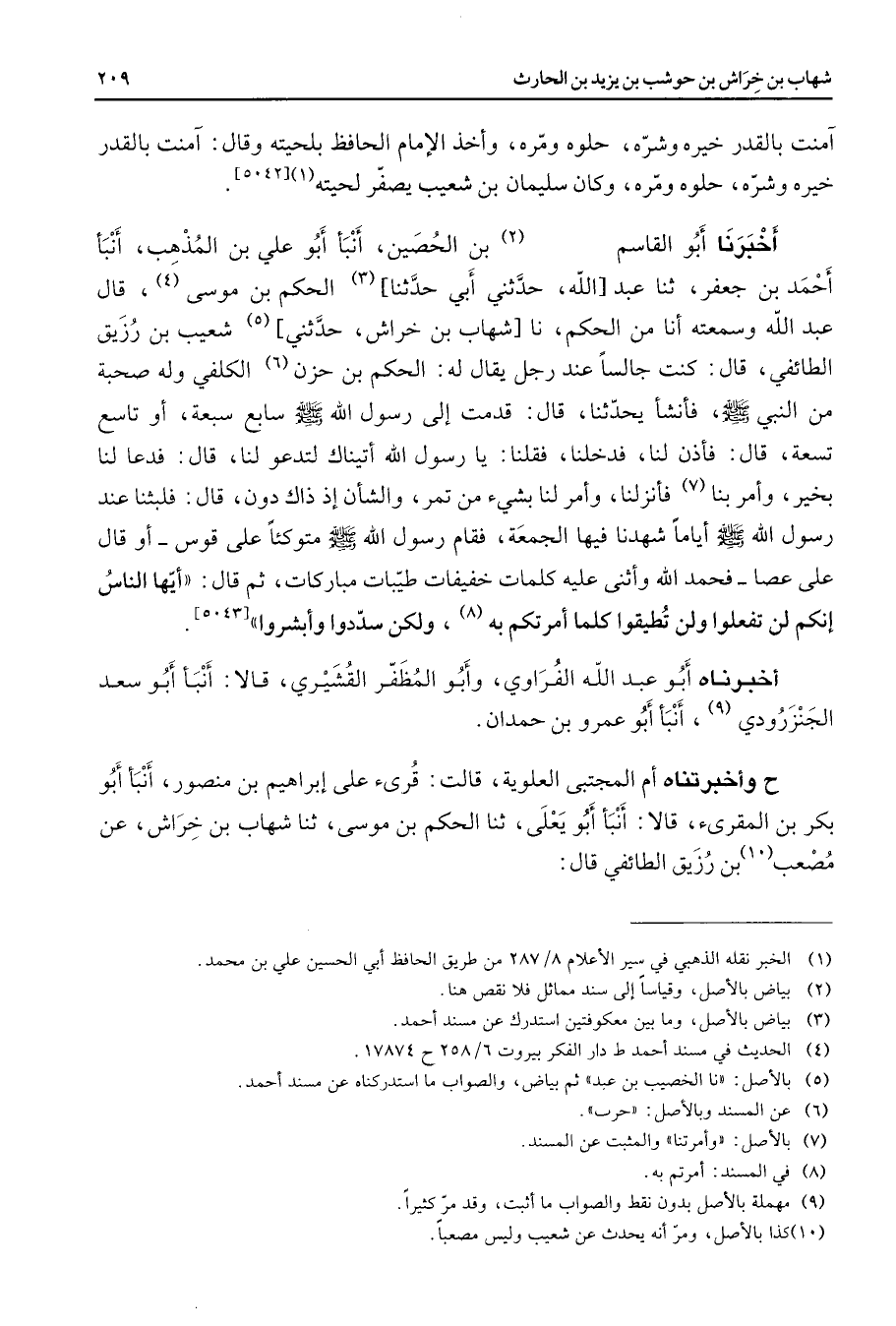 آمنت بالقدر خيره وشره حلوه ومره وأخذ الإمام الحافظ بلحيته وقال آمنت بالقدر خيره وشره حلوه ومره وكان سليمان بن شعيب يصفر لحيته (1) أخبرنا أبو القاسم (2) بن الحصين أنبأ أبو علي بن المذهب أنبأ أحمد بن جعفر ثنا عبد الله حدثني أبي حدثنا (3) الحكم بن موسى (4) قال عبد الله وسمعته أنا من الحكم نا شهاب بن خراش حدثني (5) شعيب بن رزيق الطائفي قال كنت جالسا عند رجل يقال له الحكم بن حزن (6) الكلفي وله صحبة من النبي (صلى الله عليه وسلم) فأنشأ يحدثنا قال قدمت إلى رسول الله (صلى الله عليه وسلم) سابع سبعة أو تاسع تسعة قال فأذن لنا فدخلنا فقلنا يا رسول الله أتيناك لتدعو لنا قال فدعا لنا بخير وأمر بنا (7) فأنزلنا وأمر لنا بشئ من تمر والشأن إذ ذاك دون قال فلبثنا عند رسول الله (صلى الله عليه وسلم) أياما شهدنا فيها الجمعة فقام رسول الله (صلى الله عليه وسلم) متوكئا على قوس أو قال على عصا فحمد الله وأثنى عليه كلمات خفيفات طيبات مباركات ثم قال أيها الناس إنكم لن تفعلوا ولن تطيقوا كلما أمرتكم (8) به ولكن سددوا وأبشروا أخبرناه أبو عبد الله الفراوي وأبو المظفر القشيري قالا أنبأ أبو سعد الجنزرودي (9) أنبأ أبو عمرو بن حمدان ح وأخبرتناه أم المجتبى العلوية قالت قرئ على إبراهيم بن منصور أنبأ أبو بكر بن المقرئ قالا أنبأ أبو يعلى ثنا الحكم بن موسى ثنا شهاب بن خراش عن مصعب (10) بن رزيق الطائفي قال