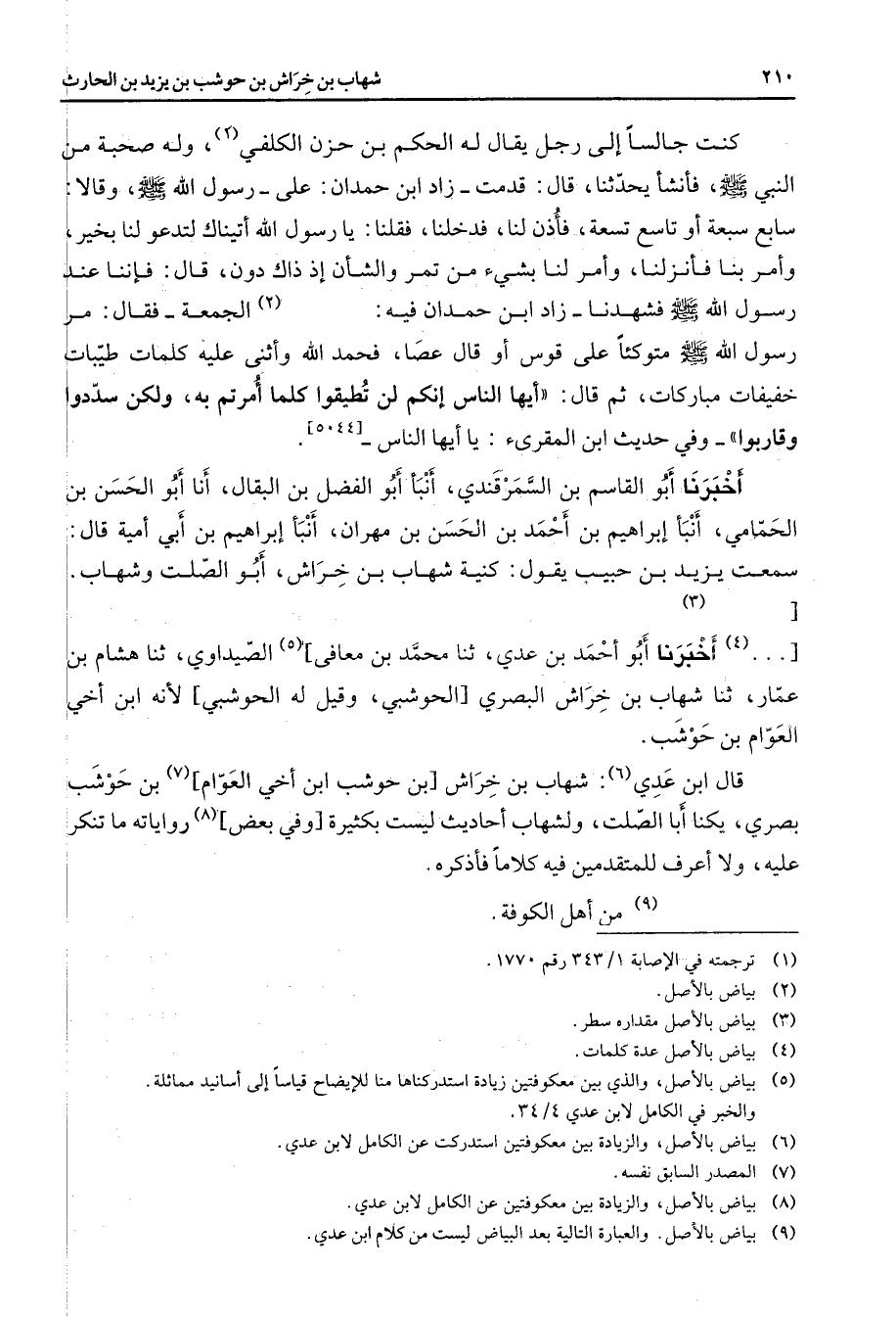 (4) أخبرنا أبو أحمد بن عدي ثنا محمد بن معافى (5) الصيداوي ثنا هشام بن عمار ثنا شهاب بن خراش البصري الحوشبي وقيل له الحوشبي لأنه ابن أخي العوام بن حوشب قال ابن عدي (6) شهاب بن خراش بن حوشب ابن أخي العوام (7) بن حوشب بصري يكنا أبا الصلت ولشهاب أحاديث ليست بكثيرة وفي بعض (8) رواياته ما تنكر عليه ولا أعرف للمتقدمين فيه كلاما فأذكره (9) من أهل الكوفة