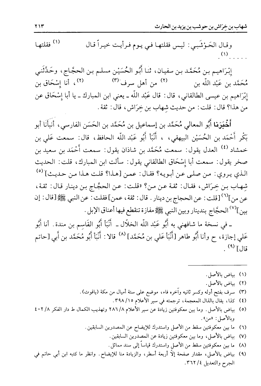 (1) إبراهيم بن محمد بن سفيان ثنا أبو الحسين مسلم بن الحجاج وحدثني محمد بن عبد الله بن (2) من أهل سرف (3) (2) أنا إسحاق بن إبراهيم بن عيسى الطالقاني قال قال عبد الله يعني ابن المبارك يا أبا إسحاق عن من هذا قال قلت من حديث شهاب بن خراش قال ثقة أخبرنا أبو المعالي محمد بن إسماعيل بن محمد بن الحسن الفارسي أنبأنا أبو بكر أحمد بن الحسين البيهقي أنبأ أبو عبد الله الحافظ قال سمعت علي بن خمشاد (4) العدل يقول سمعت محمد بن شاذان يقول سمعت أحمد بن سعيد بن صخر يقول سمعت أبا إسحاق الطالقاني يقول سألت ابن المبارك قلت الحديث الذي يروي من صلى عن أبويه فقال عمن هذا قلت هذا من حديث (5) شهاب بن خراش فقال ثقة عن من قلت عن الحجاج بن دينار قال ثقة عن من (6) قلت عن الحجاج بن دينار قال ثقة عمن فقلت عن النبي (صلى الله عليه وسلم) قال إن بين (7) الحجاج بن دينار وبين النبي (صلى الله عليه وسلم) مفازة تنقطع فيها أعناق الإبل في نسخة ما شافهني به أبو عبد الله الخلال أنبأ أبو القاسم بن مندة أنا أبو علي إجازة وأنا أبو طاهر أنبأ علي بن محمد (8) قالا أنبأ أبو محمد بن أبي حاتم قال (9)