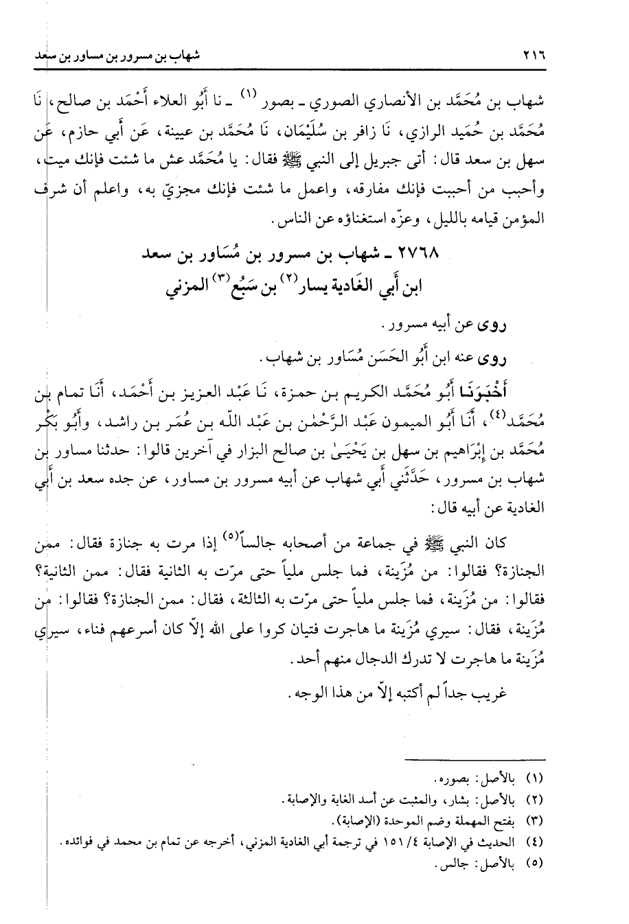 2768 - شهاب بن مسرور بن مساور بن سعد ابن أبي الغادية يسار (2) بن سبع (3) المزني روى عن أبيه مسرور روى عنه ابن أبو الحسن مساور بن شهاب أخبرنا أبو محمد عبد الكريم بن حمزة نا عبد العزيز بن أحمد أنا تمام بن محمد (4) أنا أبو الميمون عبد الرحمن بن عبد الله بن عمر بن راشد وأبو بكر محمد بن إبراهيم بن سهل بن يحيى بن صالح البزار في آخرين قالوا حدثنا مساور بن شهاب بن مسرور حدثني أبي شهاب عن أبيه مسرور بن مساور عن جده سعد بن أبي الغادية عن أبيه قال كان النبي (صلى الله عليه وسلم) في جماعة من أصحابه جالسا إذا مرت به جنازة فقال ممن الجنازة فقالوا من مزينة فما جلس مليا حتى مرت به الثانية فقال ممن الثانية فقالوا من مزينة فما جلس مليا حتى مرت به الثالثة فقال ممن الجنازة فقالوا من مزينة فقال سيري مزينة ما هاجرت فتيان كروا على الله إلا كان أسرعهم فناء سيري مزينة ما هاجرت لا تدرك الدجال منهم أحد غريب جدا لم أكتبه إلا من هذا الوجه