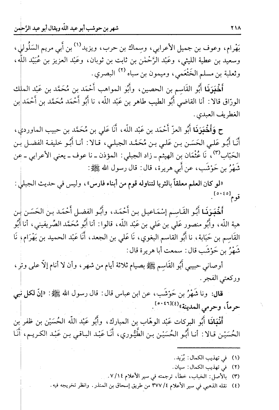 بهرام وعوف بن جميل الأعرابي وسماك بن حرب ويزيد (1) بن أبي مريم السلولي وسعيد بن عطية الليثي وعبد الرحمن بن ثابت بن ثوبان وعبد العزيز بن عبيد الله وثعلبة بن مسلم الخثعمي وميمون بن سباه (2) البصري أخبرنا أبو القاسم بن الحصين وأبو المواهب أحمد بن محمد بن عبد الملك الوراق قالا أنا القاضي أبو الطيب طاهر بن عبد الله نا أبو أحمد محمد بن أحمد بن الغطريف العبدي ح وأخبرنا أبو العز أحمد بن عبد الله أنا علي بن محمد بن حبيب الماوردي أنا أبو علي الحسن بن علي بن محمد الجبلي قالا أنا أبو خليفة الفضل بن الحباب (3) نا عثمان بن الهيثم زاد الجبلي المؤذن نا عوف يعني الأعرابي عن شهر بن حوشب عن أبي هريرة قال قال رسول الله (صلى الله عليه وسلم) لو كان العلم معلقا بالثريا لتناوله قوم من أبناء فارس وليس في حديث الجبلي قوم أخبرنا أبو القاسم إسماعيل بن أحمد وأبو الفضل أحمد بن الحسن بن هبة وأبو منصور علي بن علي بن عبد الله قالوا أنا أبو الصريفيني أنا أبو القاسم بن حبابة نا أبو القاسم البغوي نا علي بن الجعد أنا عبد الحميد بن بهرام نا شهر بن حوشب قال سمعت أبا هريرة قال أوصاني حبيبي أبو القاسم (صلى الله عليه وسلم) بصيام ثلاثة أيام من شهر وأن لا أنام إلا على وتر وركعتي الفجر قال ونا شهر بن حوشب عن ابن عباس قال قال رسول الله (صلى الله عليه وسلم) إن لكل نبي حرما وحرمي المدينة (4) [* *] أنبأنا أبو البركات عبد الوهاب بن المبارك وأبو عبد الله الحسين بن ظفر بن الحسين قالا أنا أبو الحسين بن الطيوري أنا عبد الباقي بن عبد الكريم أنا
