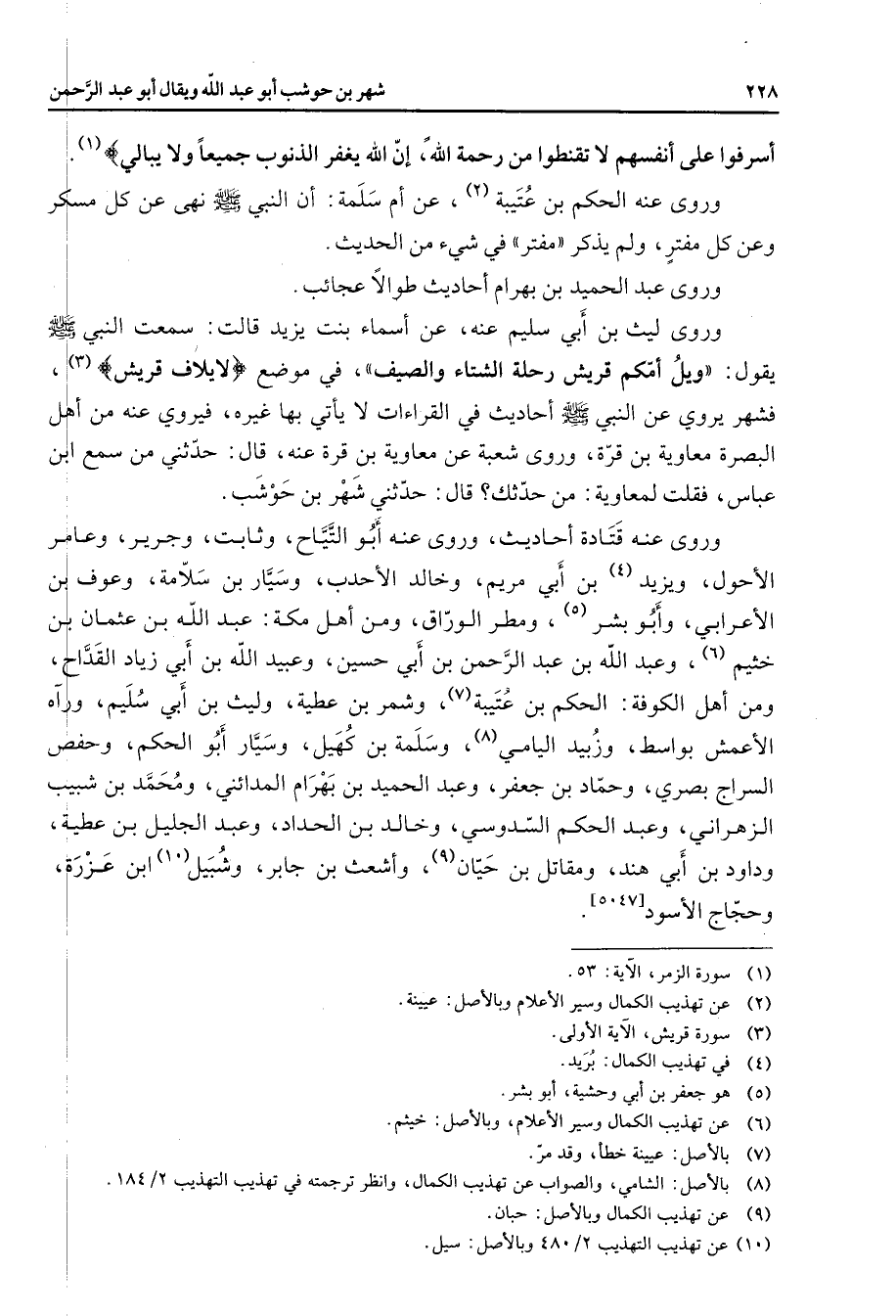 أسرفوا على أنفسهم لا تقنطوا من رحمة الله إن الله يغفر الذنوب جميعا ولا يبالي " (1) وروى عنه الحكم بن عتيبة (2) عن أم سلمة أن النبي (صلى الله عليه وسلم) نهى عن كل مسكر وعن كل مفتر ولم يذكر مفتر في شئ من الحديث وروى عبد الحميد بن بهرام أحاديث طوالا عجائب وروى ليث بن أبي سليم عنه عن أسماء بنت يزيد قالت سمعت النبي (صلى الله عليه وسلم) يقول ويل أمكم قريش رحلة الشتاء والصيف في موضع " لايلاف قريش " (3) فشهر يروي عن النبي (صلى الله عليه وسلم) أحاديث في القراءات لا يأتي بها غيره فيروي عنه من أهل البصرة معاوية بن قرة وروى شعبة عن معاوية بن قرة عنه قال حدثني من سمع ابن عباس فقلت لمعاوية من حدثك قال حدثني شهر بن حوشب وروى عنه قتادة أحاديث وروى عنه أبو التياح وثابت وجرير وعامر الأحول ويزيد (4) بن أبي مريم وخالد الأحدب وسيار بن سلامة وعوف بن الأعرابي وأبو بشر (5) ومطر الوراق ومن أهل مكة عبد الله بن عثمان بن خثيم (6) وعبد الله بن عبد الرحمن بن أبي حسين وعبيد الله بن أبي زياد القداح ومن أهل الكوفة الحكم بن عتيبة (7) وشمر بن عطية وليث بن أبي سليم ورآه الأعمش بواسط وزبيد اليامي (8) وسلمة بن كهيل وسيار أبو الحكم وحفص السراج بصري وحماد بن جعفر وعبد الحميد بن بهرام المدائني ومحمد بن شبيب الزهراني وعبد الحكم السدوسي وخالد بن الحداد وعبد الجليل بن عطية وداود بن أبي هند ومقاتل بن حيان (9) وأشعث بن جابر وشبيل (10) ابن عزرة وحجاج الأسود