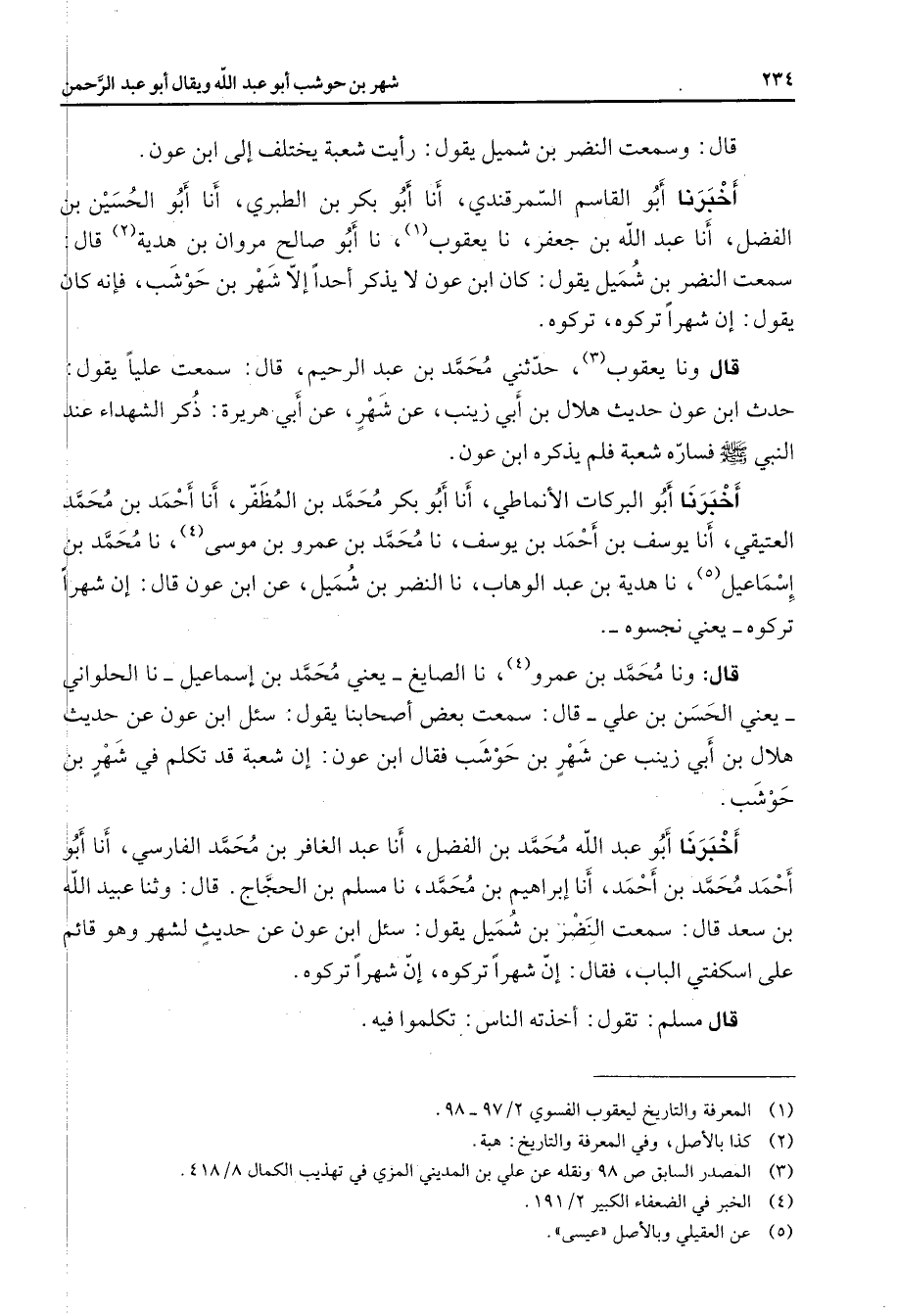 قال وسمعت النضر بن شميل يقول رأيت شعبة يختلف إلى ابن عون أخبرنا أبو القاسم السمرقندي أنا أبو بكر بن الطبري أنا أبو الحسين بن الفضل أنا عبد الله بن جعفر نا يعقوب (1) نا أبو صالح مروان بن هدية (2) قال سمعت النضر بن شميل يقول كان ابن عون لا يذكر أحدا إلا شهر بن حوشب فإنه كان يقول إن شهرا تركوه تركوه قال ونا يعقوب (3) حدثني محمد بن عبد الرحيم قال سمعت عليا يقول حدث ابن عون حديث هلال بن أبي زينب عن شهر عن أبي هريرة ذكر الشهداء عند النبي (صلى الله عليه وسلم) فساره شعبة فلم يذكره ابن عون أخبرنا أبو البركات الأنماطي أنا أبو بكر محمد بن المظفر أنا أحمد محمد العتيقي أنا يوسف بن أحمد بن يوسف نا محمد بن عمرو بن موسى (4) نا محمد بن إسماعيل (5) نا هدية بن عبد الوهاب نا النضر بن شميل عن ابن عون قال إن شهرا تركوه يعني نجسوه قال ونا محمد بن عمرو (4) نا الصايغ يعني محمد بن إسماعيل نا الحلواني يعني الحسن بن علي قال سمعت بعض أصحابنا يقول سئل ابن عون عن حديث هلال بن أبي زينب عن شهر بن حوشب فقال ابن عون إن شعبة قد تكلم في شهر بن حوشب أخبرنا أبو عبد الله محمد بن الفضل أنا عبد الغافر بن محمد الفارسي أنا أبو أحمد بن محمد بن أحمد أنا إبراهيم بن محمد نا مسلم بن الحجاج قال وثنا عبيد الله بن سعد قال سمعت النضر بن شميل يقول سئل ابن عون عن حديث لشهر وهو قائم على اسكفتي الباب فقال إن شهرا تركوه إن شهرا تركوه قال مسلم تقول أخذته الناس تكلموا فيه