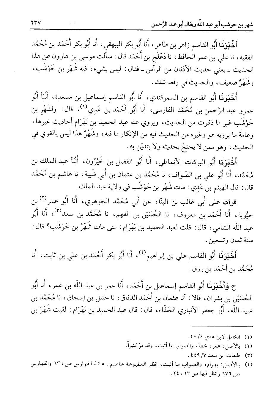 أخبرنا أبو القاسم زاهر بن طاهر أنا أبو بكر البيهقي أنا أبو بكر أحمد بن محمد الفقيه نا علي بن عمر الحافظ نا دعلج بن أحمد قال سألت موسى بن هارون عن هذا الحديث يعني حديث الأذنان من الرأس فقال ليس بشئ فيه شهر بن حوشب وشهر ضعيف والحديث في رقعه شك أخبرنا أبو القاسم بن السمرقندي أنا أبو القاسم إسماعيل بن مسعدة أنبأ أبو عمرو عبد الرحمن بن محمد الفارسي أنا أبو أحمد بن عدي (1) قال ولشهر بن حوشب غير ما ذكرت من الحديث ويروي عنه عبد الحميد بن بهرام أحاديث غيرها وعامة ما يرويه هو وغيره من الحديث فيه من الإنكار ما فيه وشهر هذا ليس بالقوي في الحديث وهو ممن لا يحتج بحديثه ولا يتدين به أخبرنا أبو البركات الأنماطي أنا أبو الفضل بن خيرون أنبأ عبد الملك بن محمد أنا أبو علي بن الصواف نا محمد بن عثمان بن أبي شيبة نا هاشم بن محمد قال قال الهيثم بن عدي مات شهر بن حوشب في ولاية عبد الملك قرأت على أبي غالب بن البنا عن أبي محمد الجوهري أنا أبو عمر (2) بن حيوية أنا أحمد بن معروف نا الحسين بن الفهم نا محمد بن سعد (3) أنا أبو عبد الله الشامي قال قلت لعبد الحميد بن بهرام متى مات شهر بن حوشب قال سنة ثمان وتسعين أخبرنا أبو القاسم علي بن إبراهيم (4) أنا أبو بكر أحمد بن علي بن ثابت أنا محمد بن أحمد بن رزق ح وأخبرنا أبو القاسم إسماعيل بن أحمد أنا عمر بن عبد الله بن عمر أنا أبو الحسين بن بشران قالا أنا عثمان بن أحمد الدقاق نا حنبل بن إسحاق نا محمد بن عبيد الله أبو جعفر الأنباري الحذاء قال قال عبد الحميد بن بهرام لقيت شهر بن