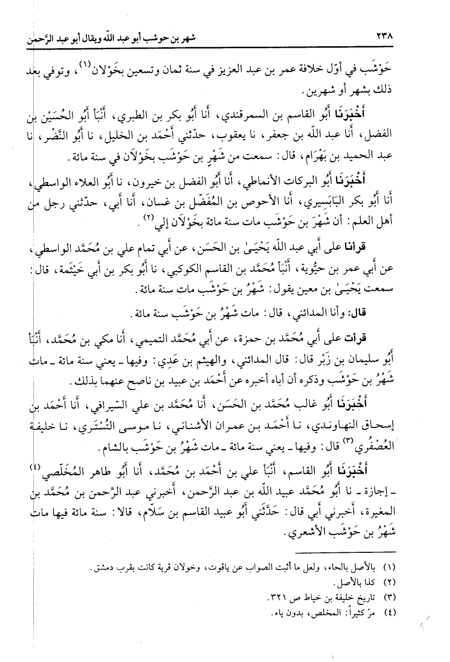 حوشب في أول خلافة عمر بن عبد العزيز في سنة ثمان وتسعين بخولان (1) وتوفي بعد ذلك بشهر أو شهرين أخبرنا أبو القاسم بن السمرقندي أنا أبو بكر بن الطبري أنبأ أبو الحسين بن الفضل أنا عبد الله بن جعفر نا يعقوب حدثني أحمد بن الخليل نا أبو النضر نا عبد الحميد بن بهرام قال سمعت من شهر بن حوشب بخولان في سنة مائة أخبرنا أبو البركات الأنماطي أنا أبو الفضل بن خيرون نا أبو العلاء الواسطي أنا أبو بكر البابسيري أنا الأحوص بن المفضل بن غسان أنا أبي حدثني رجل من أهل العلم أن شهر بن حوشب مات سنة مائة بخولان إلي (2) قرأنا على أبي عبد الله يحيى بن الحسن عن أبي تمام علي بن محمد الواسطي عن أبي عمر بن حيوية أنبأ محمد بن القاسم الكوكبي نا أبو بكر بن أبي خيثمة قال سمعت يحيى بن معين يقول شهر بن حوشب مات سنة مائة قال وأنا المدائني قال مات شهر بن حوشب سنة مائة قرأت على أبي محمد بن حمزة عن أبي محمد التميمي أنا مكي بن محمد أنبأ أبو سليمان بن زبر قال قال المدائني والهيثم بن عدي وفيها يعني سنة مائة مات شهر بن حوشب وذكره أن أباه أخبره عن أحمد بن عبيد بن ناصح عنهما بذلك أخبرنا أبو غالب محمد بن الحسن أنا محمد بن علي السيرافي أنا أحمد بن إسحاق النهاوندي نا أحمد بن عمران الأشناني نا موسى التستري نا خليفة العصفري (3) قال وفيها يعني سنة مائة مات شهر بن حوشب بالشام أخبرنا أبو القاسم أنبأ علي بن أحمد بن محمد أنا أبو طاهر المخلصي (4) إجازة نا أبو محمد عبيد الله بن عبد الرحمن أخبرني عبد الرحمن بن محمد بن المغيرة أخبرني أبي قال حدثني أبو عبيد القاسم بن سلام قالا سنة مائة فيها مات شهر بن حوشب الأشعري
