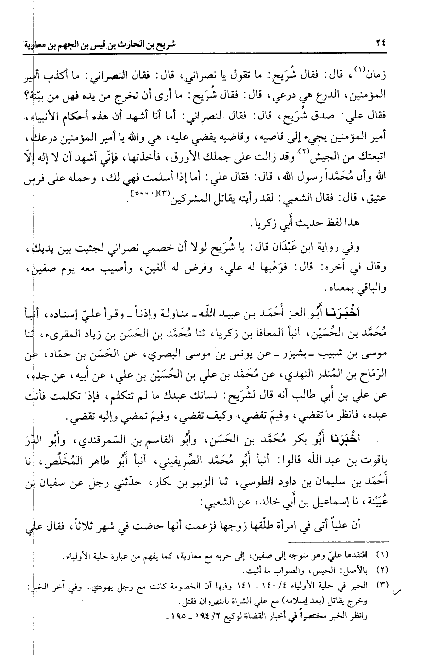 زمان (1) قال فقال شريح ما تقول يا نصراني فقال النصراني ما أكذب أمير المؤمنين الدرع هي درعي قال فقال شريح ما أرى أن تخرج من يده فهل من بينة فقال علي صدق شريح قال فقال النصراني أما أنا أشهد أن هذه أحكام الأنبياء أمير المؤمنين يجئ إلى وقاضيه يقضي عليه هي والله يا أمير المؤمنين درعك اتبعتك من الجيش (2) وقد زالت على جملك الأورق فأخذتها فإني أشهد أن لا إله إلا الله وأن محمدا رسول الله قال فقال علي أما إذا أسلمت فهي لك وحمله على فرس عتيق قال فقال الشعبي لقد رأيته يقاتل المشركين [* *] (3) هذا لفظ حديث أبي زكريا وفي رواية ابن عبدان قال يا شريح لولا أن خصمي نصراني لجثيت بين يديك وقال في آخره قال فوهبها له علي وفرض له ألفين وأصيب معه يوم صفين والباقي بمعناه أخبرنا أبو العز أحمد بن عبيد الله مناولة وإذنا وقرأ علي إسناده أنبأ محمد بن الحسين أنبأ المعافا بن زكريا ثنا محمد بن الحسن بن زياد المقرئ ثنا موسى بن شبيب بشيزر عن يونس بن موسى البصري عن الحسن بن حماد عن الرماح بن المنذر النهدي عن محمد بن علي بن الحسين بن علي عنأبيه عن جده عن علي بن أبي طالب أنه قال لشريح لسانك عبدك ما لم تتكلم فإذا تكلمت فأنت عبده فانظر ما تقضي وفيم تقضي وكيف تقضي وفيم تمضي وإليه تقضي أخبرنا أبو بكر محمد بن الحسن وأبو القاسم بن السمرقندي وأبو الدر ياقوت بن عبد الله قالوا أنبأ أبو محمد الصريفيني أنبأ أبو طاهر المخلص نا أحمد بن سليمان بن داود الطوسي ثنا الزبير بن بكار حدثني رجل عن سفيان بن عيينة نا إسماعيل بن أبي خالد عن الشعبي أن عليا أتى في امرأة طلقها زوجها فزعمت أنها حاضت في شهر ثلاثا فقال علي