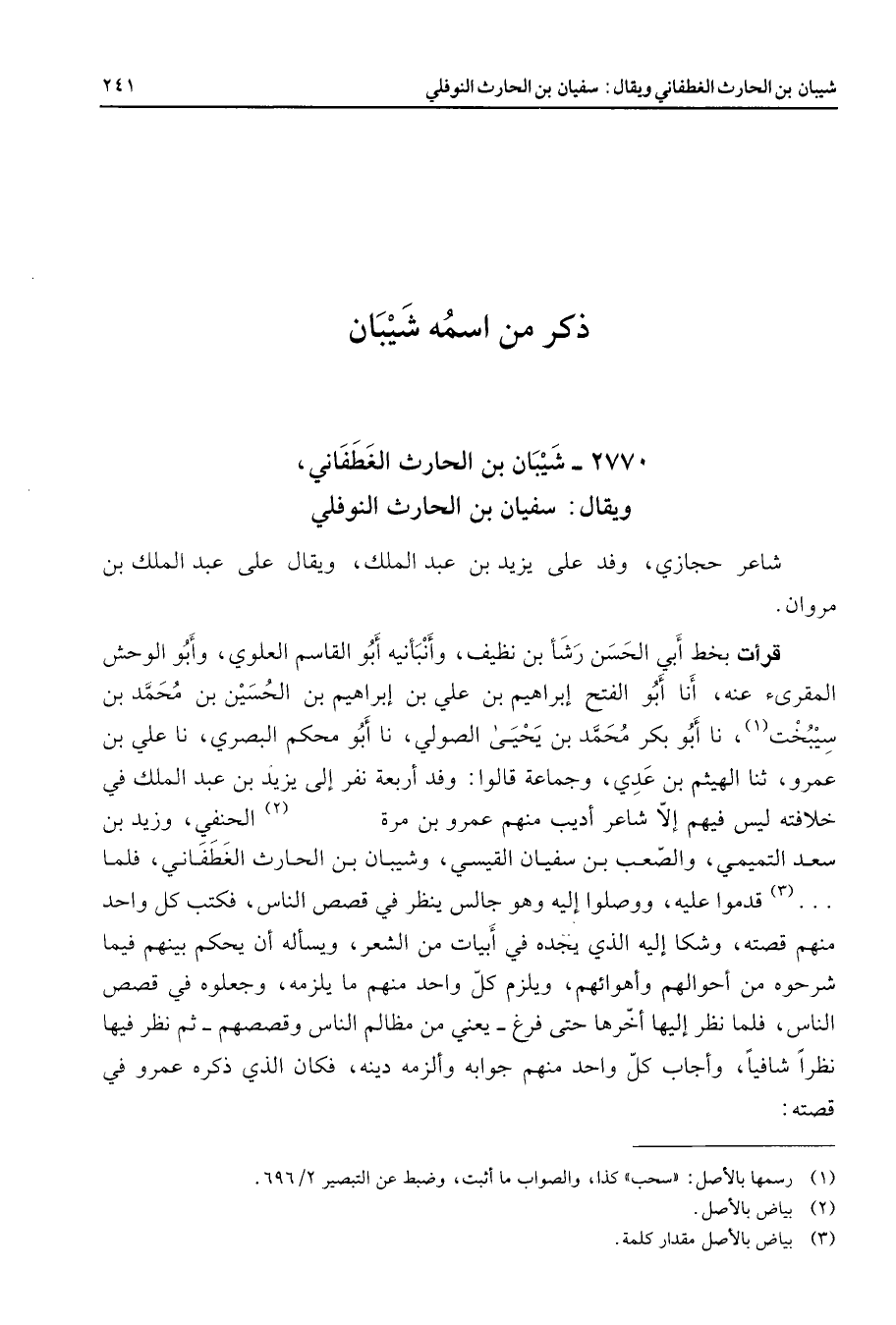 2770 - شيبان بن الحارث الغطفاني ويقال سفيان بن الحارث النوفلي شاعر حجازي وفد على يزيد بن عبد الملك ويقال على عبد الملك بن مروان قرأت بخط أبي الحسن رشأ بن نظيف وأنبأنيه أبو القاسم العلوي وأبو الوحش المقرئ عنه أنا أبو الفتح إبراهيم بن علي بن إبراهيم بن الحسين بن محمد بن سيبخت (1) نا أبو بكر محمد بن يحيى الصولي نا أبو محكم البصري نا علي بن عمرو ثنا الهيثم بن عدي وجماعة قالوا وفد أربعة نفر إلى يزيد بن عبد الملك في خلافته ليس فيهم إلا شاعر أديب منهم عمرو بن مرة (2) الحنفي وزيد بن سعد التميمي والصعب بن سفيان القيسي وشيبان بن الحارث الغطفاني فلما