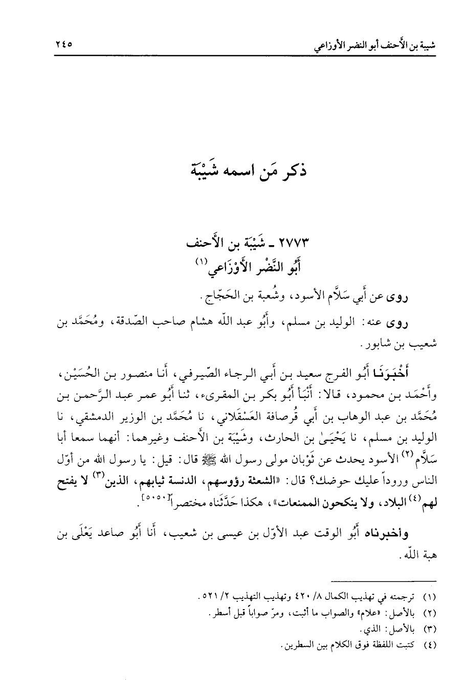 2773 - شيبة بن الأحنف أبو النضر الأوزاعي (1) روى عن أبي الإسلام الأسود وشعبة بن الحجاج روى عنه الوليد بن مسلم وأبو عبد الله هشام صاحب الصدقة ومحمد بن شعيب بن شابور أخبرنا أبو الفرج سعيد بن أبي الرجاء الصيرفي أنا منصور بن الحسين وأحمد بن محمود قالا أنبأ أبو بكر بن المقرئ ثنا أبو عمر عبد الرحمن بن محمد بن عبد الوهاب بن أبي قرصافة العسقلاني نا محمد بن الوزير الدمشقي نا الوليد بن مسلم نا يحيى بن الحارث وشيبة بن الأحنف وغيرهما أنهما سمعا أبا سلام (2) الأسود يحدث عن ثوبان مولى رسول الله (صلى الله عليه وسلم) قال قيل يا رسول الله من أول الناس ورودا عليك حوضك قال الشعثة رؤوسهم الدنسة ثيابهم الذين (3) لا يفتح لهم (4) البلاد ولا ينكحون الممنعات هكذا حدثناه مختصرا وأخبرناه أبو الوقت عبد الأول بن عيسى بن شعيب أنا أبو صاعد يعلى بن هبة الله