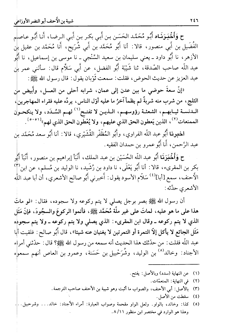 ح وأخبرناه أبو محمد الحسن بن أبي بكر بن أبي الرضا أنا أبو عاصم الفضيل بن أبي منصور قالا أنا أبو محمد بن أبي شريح أنا محمد بن عقيل بن الأزهر نا أبو داود يعني سليمان بن سعيد السنجي نا موسى بن إسماعيل نا أبو عبد الله صاحب الصدقة ثنا شيبة أبو الفضل عن أبي سلام قال سألني عمر بن عبد العزيز عن حديث الحوض فقلت سمعت ثوبان يقول قال رسول الله (صلى الله عليه وسلم) إن سعة حوضي ما بين عدن إلى عمان شرابه أحلى من العسل وأبيض من الثلج من شرب منه شربة لم يظمأ آخر ما عليه أول الناس يرده عليه فقراء المهاجرين الدنسة ثيابهم الشعثة رؤوسهم الذين لا تفتح (1) لهم السدد ولا ينكحون الممنعات (2) الذين يعطون الحق الذي عليهم ولا يعطون الحق الذي لهم أخبرنا أبو عبد الله الفراوي وأبو المظفر القشيري قالا أنا أبو سعد محمد بن عبد الرحمن أنا أبو عمرو بن حمدان الفقيه ح وأخبرنا أبو عبد الله الحسين بن عبد الملك أنبأ إبراهيم بن منصور أنبأ أبو بكر بن المقرئ قالا أنا أبو يعلى نا داود بن رشيد نا الوليد بن مسلم عن ابن (3) الأحنف سمع أبا (4) سلام الأسود يقول أخبرني أبو صالح الأشعري أن أبا عبد الله الأشعري حدثه أن رسول الله (صلى الله عليه وسلم) بصر برجل يصلي لا يتم ركوعه ولا سجوده فقال لو مات هذا على ما هو عليه لمات على غير ملة محمد (صلى الله عليه وسلم) فأتموا الركوع والسجود فإن مثل الذي لا يتم ركوعه وقال ابن المقرئ الذي يصلي ولا يتم ركوعه ولا يتم سجوده مثل الجائع لا يأكل إلا التمرة أو التمرتين لا يغنيان عنه شيئا قال أبو صالح فلقيت أبا عبد الله فقلت من حدثك هذا الحديث أنه سمعه من رسول الله (صلى الله عليه وسلم) قال حدثني أمراء الأجناد وخالد (5) بن الوليد وشرحبيل بن حسنة وعمرو بن العاص أنهم سمعوه