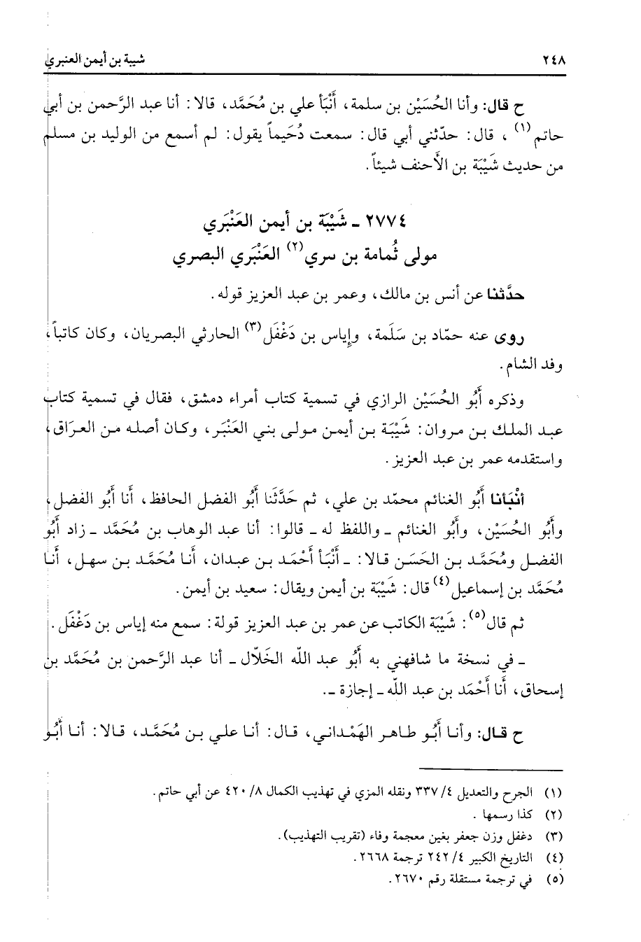 2774 - شيبة بن أيمن العنبري مولى ثمامة بن سري (2) العنبري البصري حدثنا عن أنس بن مالك وعمر بن عبد العزيز قوله روى عنه حماد بن سلمة وإياس بن دغفل (3) الحارثي البصريان وكان كاتبا وفد الشام وذكره أبو الحسين الرازي في تسمية كتاب أمراء دمشق فقال في تسمية كتاب عبد الملك بن مروان شيبة بن أيمن مولى بني العنبر وكان أصله من العراق واستقدمه عمر بن عبد العزيز أنبأنا أبو الغنائم محمد بن علي ثم حدثنا أبو الفضل الحافظ أنا أبو الفضل وأبو الحسين وأبو الغنائم واللفظ له قالوا أنا عبد الوهاب بن محمد زاد أبو الفضل ومحمد بن الحسن قالا أنبأ أحمد بن عبدان أنا محمد بن صهل أنا محمد بن إسماعيل (4) قال شيبة بنأيمن ويقال سعيد بن أيمن ثم قال (5) شيبة الكاتب عن عمر بن عبد العزيز قولة سمع منه إياس بن دغفل في نسخة ما شافهني به أبو عبد الله الخلال أنا عبد الرحمن بن محمد بن إسحاق أنا أحمد بن عبد الله إجازة ح قال وأنا أبو طاهر الهمداني قال أنا علي بن محمد قالا أنا أبو