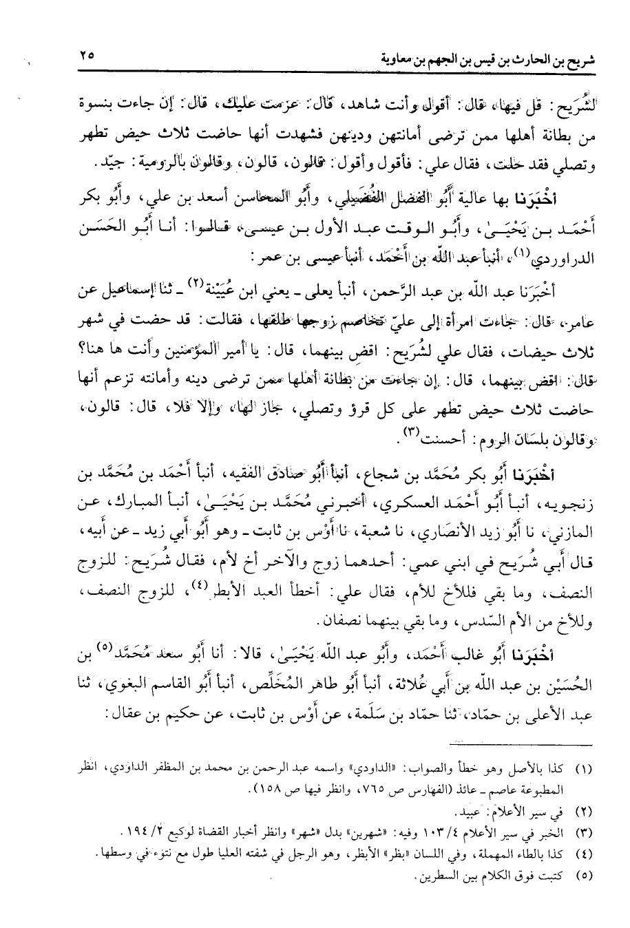 لشريح قل فيها قال أقول وأنت شاهد قال عزمت عليك قال إن جاءت بنسوة من بطانة أهلها ممن ترضى أمانتهن ودينهن فشهدت أنها حاضت ثلاث حيض تطهر وتصلي فقد حلت فقال علي فأقول وأقول قالون قالون وقالون بالرومية جيد أخبرنا بها عالية أبو الفضل الفضيلي وأبو المحاسن أسعد بن علي وأبو بكر أحمد بن يحيى وأبو الوقت عبد الأول بن عيسى قالوا أنا أبو الحسن الداوردي (1) أنبأ عبد الله بن أحمد أنبأ عيسى بن عمر أخبرنا عبد الله بن عبد الرحمن أنبأ يعلى يعني ابن عيينة (2) ثنا إسماعيل عن عامر قال جاءت امرأة إلى علي تخاصم زوجها طلقها فقالت قد حضت في شهر ثلاث حيضات فقال علي لشريح اقض بينهما قال يا أمير المؤمنين وأنت ها هنا قال اقض بنهما قال إن جاءت من بطانة أهلها ممن ترضى دينه وأمانته تزعم أنها حاضت ثلاث حيض تطهر على كل قرؤ وتصلي جاز لها وإلا فلا قال قالون وقالون بلسان الروم أحسنت (3) أخبرنا أبو بكر محمد بن شجاع أنبأ أبو صادق الفقيه أنبأ أحمد بن محمد بن زنجويه أنبأ أبو أحمد العسكري أخبرني محمد بن يحيى أنبأ المبارك عن المازني نا أبو زيد الأنصاري نا شعبة نا أوس بن ثابت وهو أبو أبي زيد عن أبيه قال أبي شريح في ابني عمي أحدهما زوج والآخر أخ لأم فقال شريح للزوج النصف وما بقي فللأخ للأم فقال علي أخطأ العبد الأبطر (4) للزوج النصف وللأخ من الأم السدس وما بقي بينهما نصفان أخبرنا أبو غالب أحمد وأبو عبد الله يحيى قالا أنا أبو سعد محمد (5) بن الحسين بن عبد الله بن أبي علاثة أنبأ أبو طاهر المخلص أنبأ أبو القاسم البغوي ثنا عبد الأعلى بن حماد ثنا حماد بن سلمة بن سلمة عن أوس بن ثابت عن حكيم بن عقال