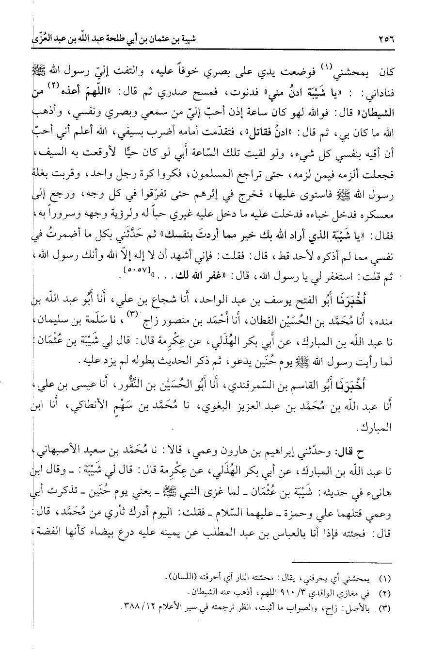 كان يمحشني (1) فوضعت يدي على بصري خوفا عليه والتفت إلي رسول الله (صلى الله عليه وسلم) فناداني يا شيبة ادن مني فدنوت فمسح صدري ثم قال اللهم أعذه (2) من الشيطان قال فوالله لهو كان ساعة إذن أحب إلي من سمعي وبصري ونفسي وأذهب الله ما كان بي ثم قال ادن فقاتل فتقدمت أمامه أضرب بسيفي الله أعلم أني أحب أن أقيه بنفسي كل شئ ولو لقيت تلك الساعة أبي لو كان حيا لأوقعت به السيف فجعلت ألزمه فيمن لزمه حتى تراجع المسلمون فكروا كرة رجل واحد وقربت بغلة رسول الله (صلى الله عليه وسلم) فاستوى عليها فخرج في إثرهم حتى تفرقوا في كل وجه ورجع إلى معسكره فدخل خباءه فدخلت عليه ما دخل عليه غيري حبا له ولرؤية وجهه وسرورا به فقال يا شيبة الذي أراد الله بك خير مما أردت بنفسك ثم حدثني بكل ما أضمرت في نفسي مما لم أذكره لأحد قط قال فقلت فإني أشهد أن لاإله إلا الله وأنك رسول الله ثم قلت استغفر لي يا رسول الله قال غفر الله لك أخبرنا أبو الفتح يوسف بن عبد الواحد أنا شجاع بن علي أنا أبو عبد الله بن منده أنا محمد بن الحسين القطان أنا أحمد بن منصور زاج (3) نا سلمة بن سليمان نا عبد الله بن المبارك عن أبي بكر الهذلي عن عكرمة قال قال لي شيبة بن عثمان لما رأيت رسول الله (صلى الله عليه وسلم) يوم حنين يدعو ثم ذكر الحديث بطوله لم يزد عليه أخبرنا أبو القاسم بن السمرقندي أنا أبو الحسين بن النقور أنا عيسى بن علي أنا عبد الله بن محمد بن عبد العزيز البغوي نا محمد بن سهم الأنطاكي أنا ابن المبارك ح قال وحدثني إبراهيم بن هارون وعمي قالا نا محمد بن سعيد الأصبهاني نا عبد الله بن المبارك عن أبي بكر الهذلي عن عكرمة قال قال لي شيبة وقال ابن هانئ في حديثه شيبة بن عثمان لما غزى النبي (صلى الله عليه وسلم) يعني يوم حنين تذكرت أبي وعمي قتلهما علي وحمزة عليهما السلام فقلت اليوم أدرك ثأري من محمد قال قال فجئته فإذا أنا بالعباس بن عبد المطلب عن يمينه عليه درع بيضاء كأنها الفضة